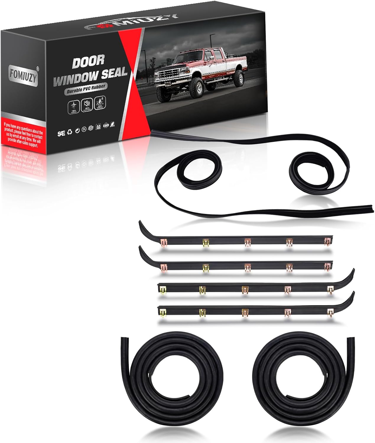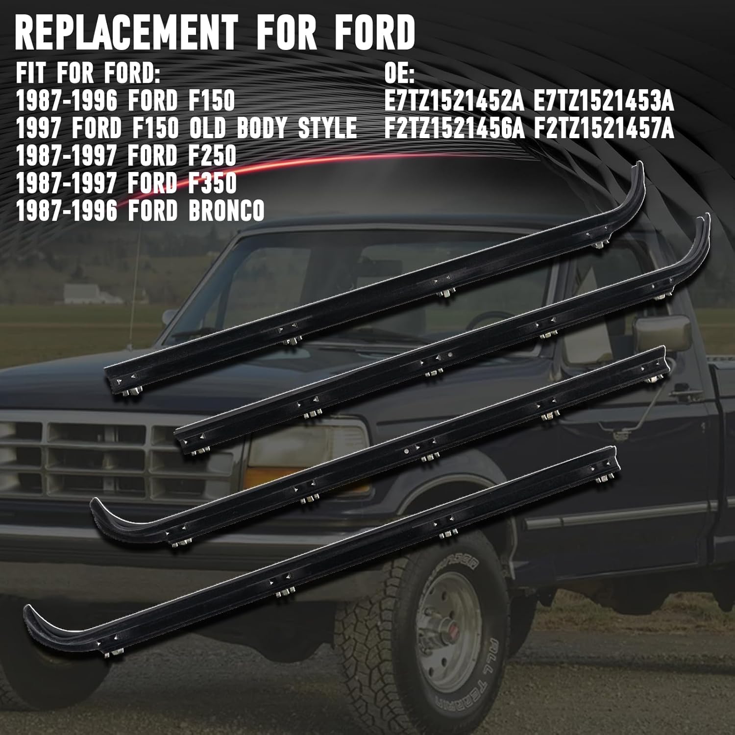 Compatible With 1987-1996 Ford F150 1997 Ford F150 Old Body Style 1987-1997 Ford F250 1987-1997 Ford F350 1987-1996 Ford Bronco Fit for both Front Left & Right Inner & OuterNote: Please check the part number before buying to make sure it fits your carNote: It is recommended to align all the clips of the 4 window seal with the holes to determine the position of each window seal before installation.Note: There is a tough steel bar in the curved part. If there is some disobedience, it can be knocked down with a rubber hammer, which can be corrected, or wrapped in a towel with a wooden stick and knocked down.About Us Our products are 100% brand new quality products, welcome to buy. With our best products and best services, we believe this will be a pleasant shopping experience. We care about our valued customers and hope to establish a long-term business relationship with you, so please help us do better.Quality Assurance 1. Each item has been factory tested and meets or exceeds oem specifications. 2. Provide lifetime warranty service. If you are not satisfied with the product or the product has quality problems, you can contact us at any time, we will provide you with a satisfactory answer and solve the after-sales problem for you.We attach great importance to quality and service. If you have any questions about the project or our services, please contact us first. We value your feedback, so we will strive to answer all inquiries within 24 hours.