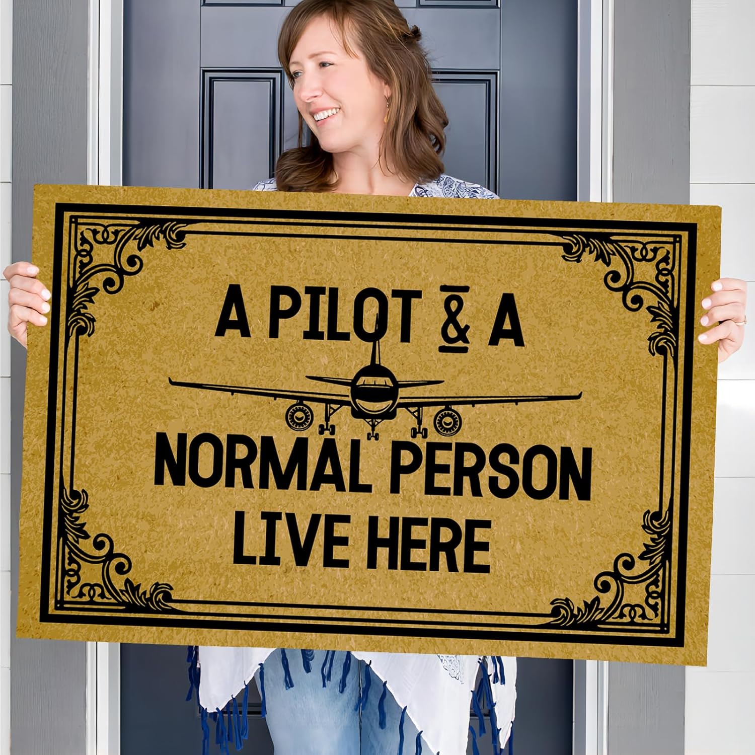 Package Including: 1 x Doormat with the text "A Pilot & a Normal Person Live Here"Material: polyester fiberSize: 23.6 x 15.7 inchesNote:Door mats indoor will make your home, house, farmhouse, kitchen clean and make you feel good. You can also give gifts to those you like on Christmas, New Year, birthday, Valentine's Day, all holidays and parties.Service: We aim to bring a great shopping experience to every customer. That’s our mission and honour to provide our customers with high quality products.