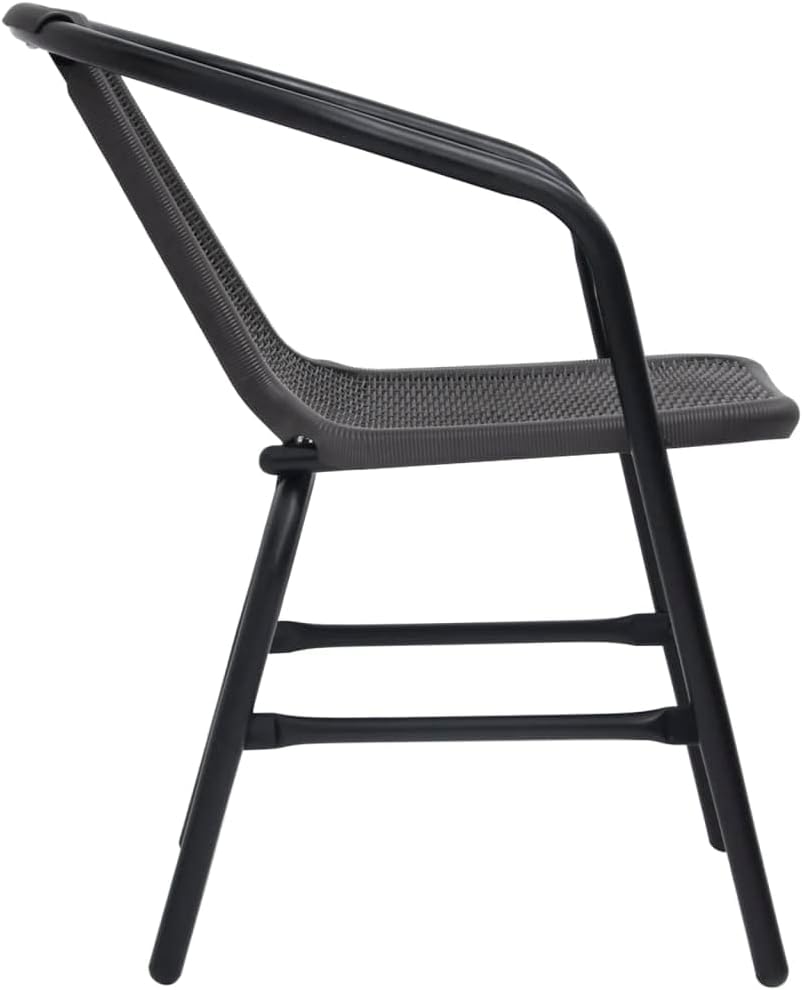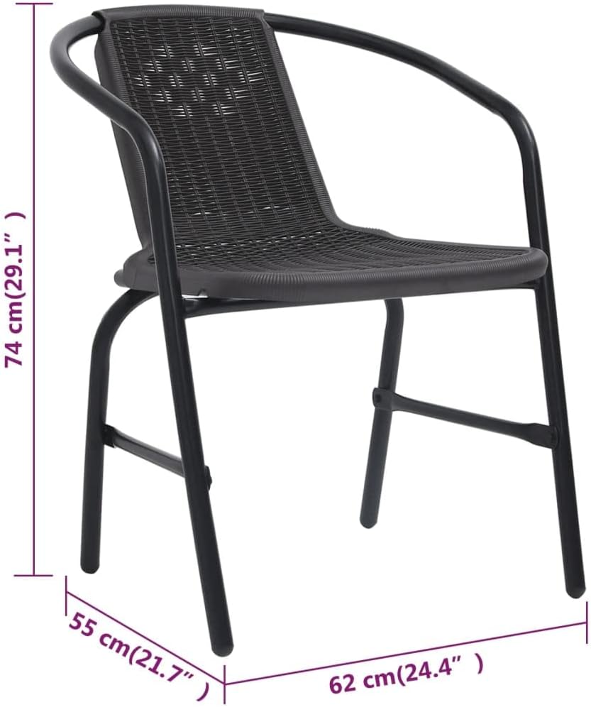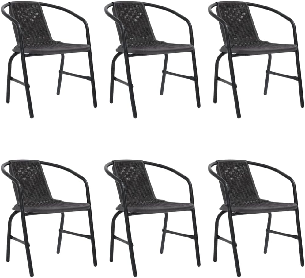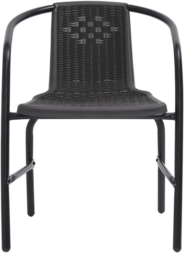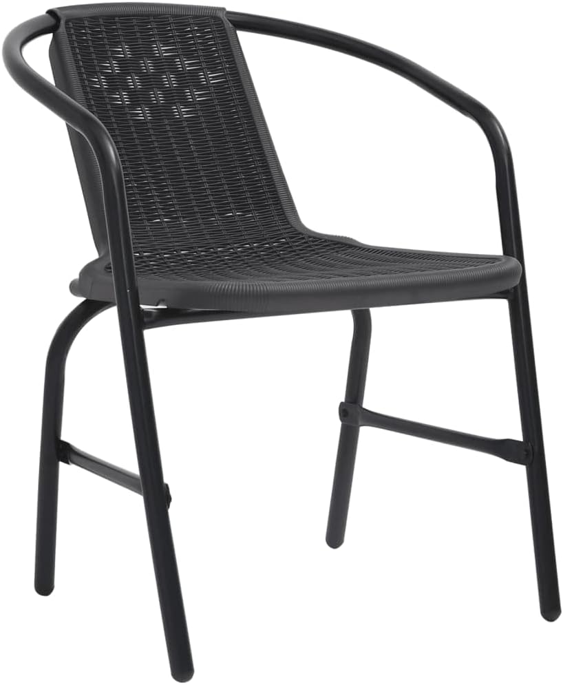 The patio chair set with rattan look is suitable for having your meals or just relaxing in the outdoors.Sturdy frame: Thanks to the steel frame, the outdoor chairs are stable and sturdy.Stackable chair: These armchairs are stackable to save space when not in use.Comfort seating: These patio chairs are made of plastic rattan, which add to seating comfort.Note:In order to extend the life of your outdoor furniture, we recommend you clean it regularly and do not leave it outdoors without protection unnecessarily.Clean: Use a mild soap solutionStoring: If possible, store in a cool, dry place indoors. If the product is stored outdoors, protect it with a waterproof cover. Wipe and dry the excess water or snow from flat surfaces after a rain or snowfall. Allow sufficient air circulation to avoid moisture-related damage.Color: BlackMaterial: Plastic rattan, steelDimensions: 24.4" x 21.7" x 29.1" (W x D x H)Maximum loading capacity: 242.5 lbRattan lookAssembly required: YesDelivery contains:4 x Chair