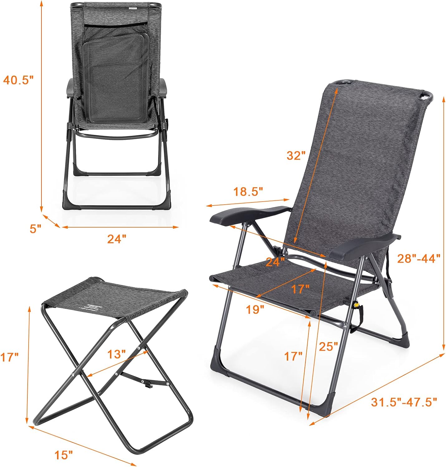 Description:Our folding chair and ottoman set are specially designed for outdoor activities, providing user’s convenience and comfort. Equipped with a matching footstool, you can enjoy the maximum relaxation lying on the patio recliner. Made of solid steel and high-strength fabric, this patio chair set can load up to 300lbs for long term use. Since its folding design, this patio chair set can be stored and carried without taking up much living space. Also, the 7-gear adjustable backrest can be reclined to an ideal position, which helps you to change postures of sitting, leaning and lying. Besides, the ergonomic armrest and backrest enhance sitting comfort. This practical outdoor chair set can be used in various places, such as backyard, garden, patio or poolside, and you can enjoy beautiful scenery with your friend or family. Features:7-gear reclining backrest can be tilted from 108° to 152°Foldable and lightweight patio chair set for easy transportation & storage Ergonomic high-back chair & matching footstool for cozy sitting experienceBreathable fabric for outdoor use accelerating heat dissipation Rear storage mesh pocket allows to store folded ottoman & magazines Heavy duty frame ensures high stability and load capacity of 300lbsWidely used in various occasions, like patio, garden & poolside2PCS patio chair sets for families and friends to enjoy together Convenient sided handle facilitates carrying Specifications:Material: Steel + Textile + Mesh ClothDining Chair Size: 31.5”-47.6" x 24" x 28.3”-43.7" (Lx W x H) Seat Size: 17.3”x 18.9” x 17.3” (D x W x H) Armrest Height: 25.2” Ottoman Size: 15.4” x 13” x 17.3” (Lx W x H) Weight Capacity: 300lbs (Chair); 66lbs (Ottoman) Folding Chair Size: 40.5” x 24” x 5” (Lx W x H) Net Weight: 29lbsPackage Inclu