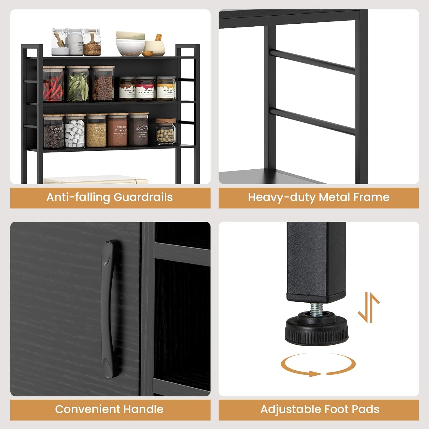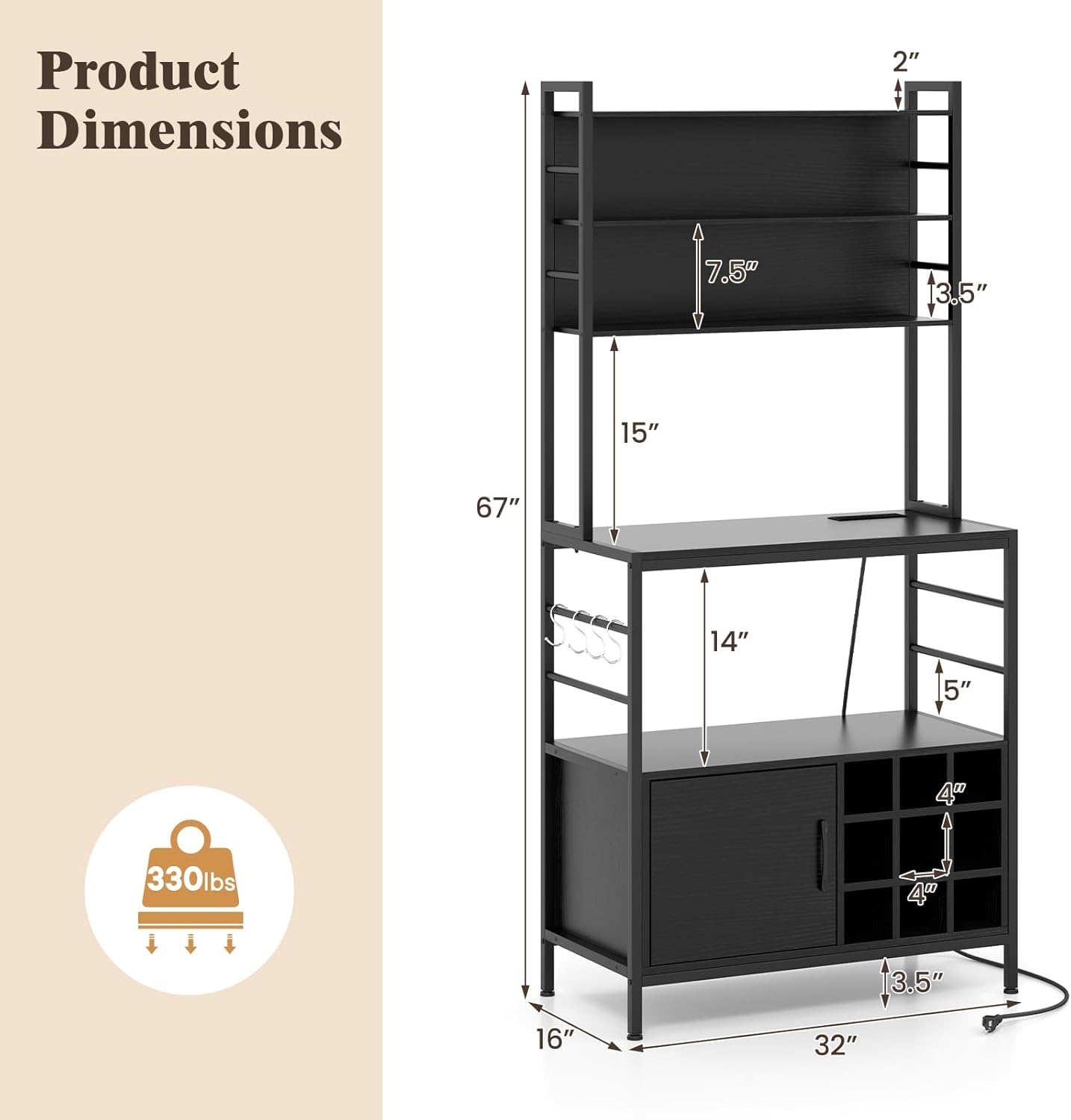 Description: Stay charged and organized with our kitchen bakers rack! With various storage options, such as open shelves, a cabinet, hanging hooks, and wine bottle holders, this microwave stand offers a comprehensive organization solution for your kitchen items. Additionally, this coffee bar cabinet is equipped with an ETL certified power outlet, featuring 2 AC outlets and 2 USB ports for charging devices and using electric appliances. The anti-rust metal frame provides stability, while adjustable foot pads ensure that the cabinet remains steady on uneven surfaces. To further secure the kitchen bakers rack, there are 2 anti-toppling devices that can be attached to the wall. Guardrails on each shelf also help to keep belongings in place. Overall, this versatile bakers rack effortlessly combines functionality and style, making it a perfect addition to your kitchen, dining room, or living room. Features: ETL certified power outlet for safe and reliable power supply Classified storage areas provide a perfect storage solution Wine bottle holders gratify your specific needs for wine storage Heavy-duty metal frame for excellent durability and sturdiness Multiple anti-falling guardrails prevent items from falling off Dual anti-toppling devices for enhanced stability and security Convenient handle makes it a breeze to open the cabinet door Adjustable foot pads for better adaption on uneven grounds Simple Assembly required Specifications: Color: Black/Rustic Brown Materials: Engineered Wood, Metal Product Dimensions: 32” x 16” x 67” (L x W x H) Height of Guardrails: 2”/3.5”/5” Height between Shelves: 7.5”/14”/15” Size of Each Wine Grid: 4” x 4” (W x H) Ground Clearance: 3.5” Length of Power Cord: 5 ft Net Weight: 66 lbs Weight Capacity of Each Upper Shelf: 44 lbs Weight Capacity of Each Middle Shelf: 130 lbs Weight Capacity of Bottle Cabinet/Wine Rack: 130 lbs Overall Weight Capacity: 330 lbs Package Includes: 1 x Kitchen Bakers Rack 1 x Power Outlet 4 x Hanging Hooks 1 x Instruction