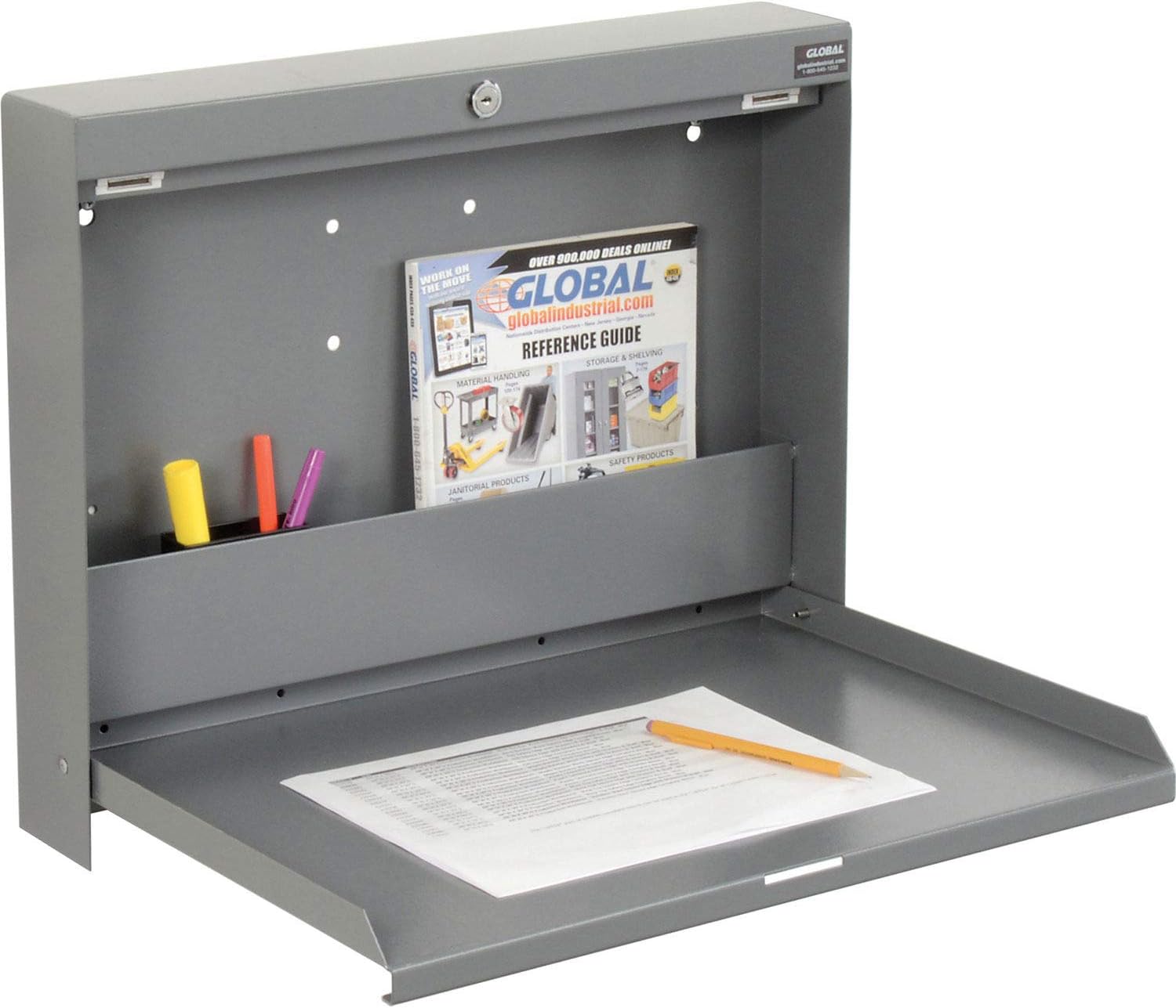 Ideal for loading docks, warehouses, factory floors, doctors offices, supply rooms, and shipping & receiving areas. Wall mount shop desk provides a work surface where you need it. Wall mount desk conveniently folds away when not in use to provide optimal work space. Folding shop desk mounts to walls at desired work height to accommodate stand-up or sit-down work positions. Made of durable steel with a scratch resistant powder coat finish. Full width handle lowers the desk to provide a convenient 13"D work surface. The interior features a convenient pen storage compartment for pens, small tools and other supplies. Also includes a storage bin for charts, folders and other literature. Magnetic closure keeps door in place. Locking desk includes a cylinder lock with 2 keys for security. Helps prevent unwanted desk opening. Measures 20"W x 3-3/8"D x 16-3/8"H. Hardware included., Lot of 1