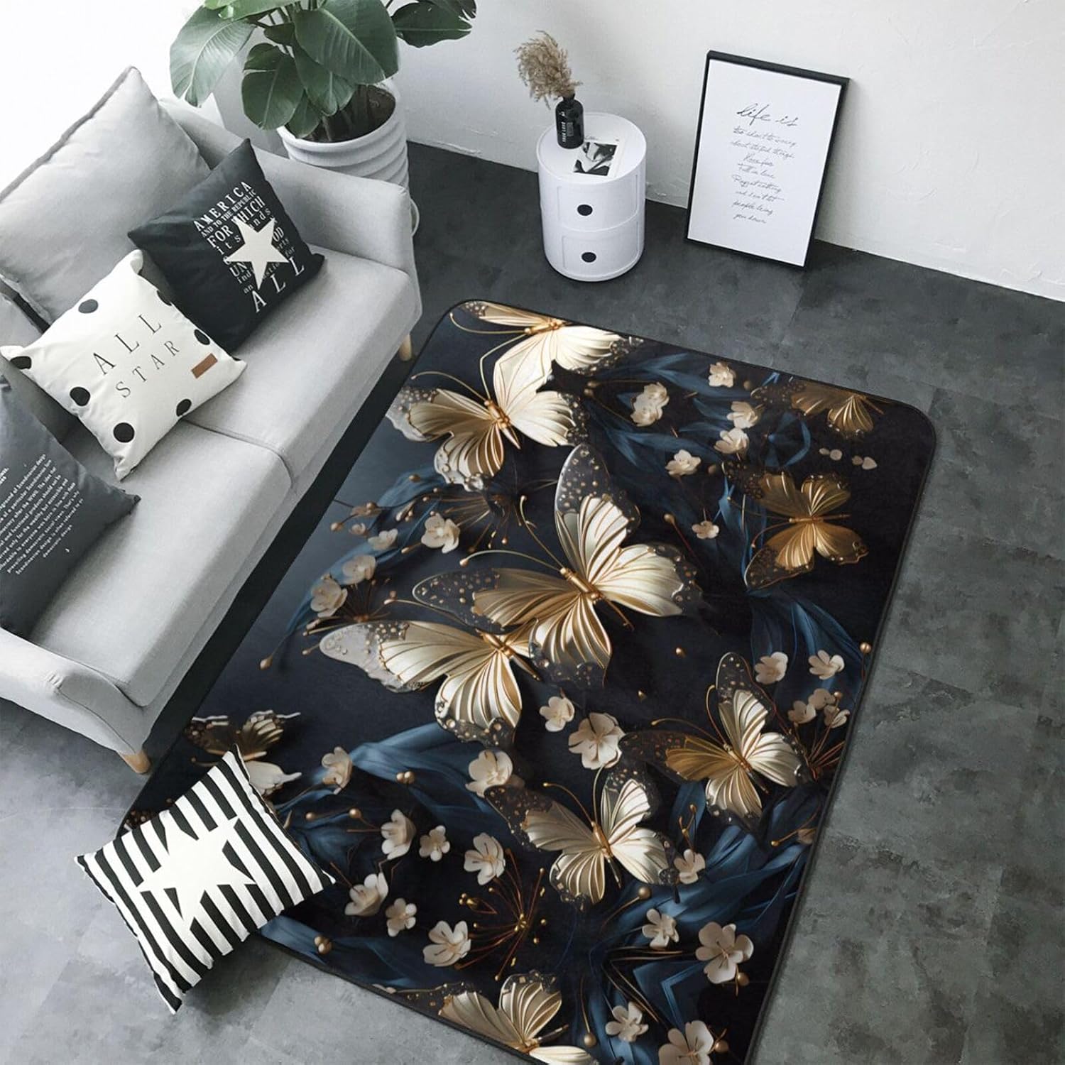 This Gold White Butterflies Black printed decorative carpet is made of polyester flannel, which is delicate and soft to the touch, with tight and regular pile. It will not pill or fade after long-term use, and will always look like new. The middle layer uses high-density memory foam, which can automatically adjust according to the foot shape and pressure, providing precise massage for tired feet and relieving fatigue. The bottom is designed with non-slip plastic bottom non-woven fabric, which can firmly grip the ground even when it encounters water or on smooth surfaces, ensuring the safety of the elderly and children. It is easy to clean daily, can be machine washed or hand washed, and is wear-resistant and does not shed. Exquisite stitching technology and high-quality tailoring, with smooth edges, are suitable for a variety of scenes such as bathrooms, living rooms, and bedrooms. Non-slip, comfortable, and durable, adding a touch of intimacy and elegance to your life.