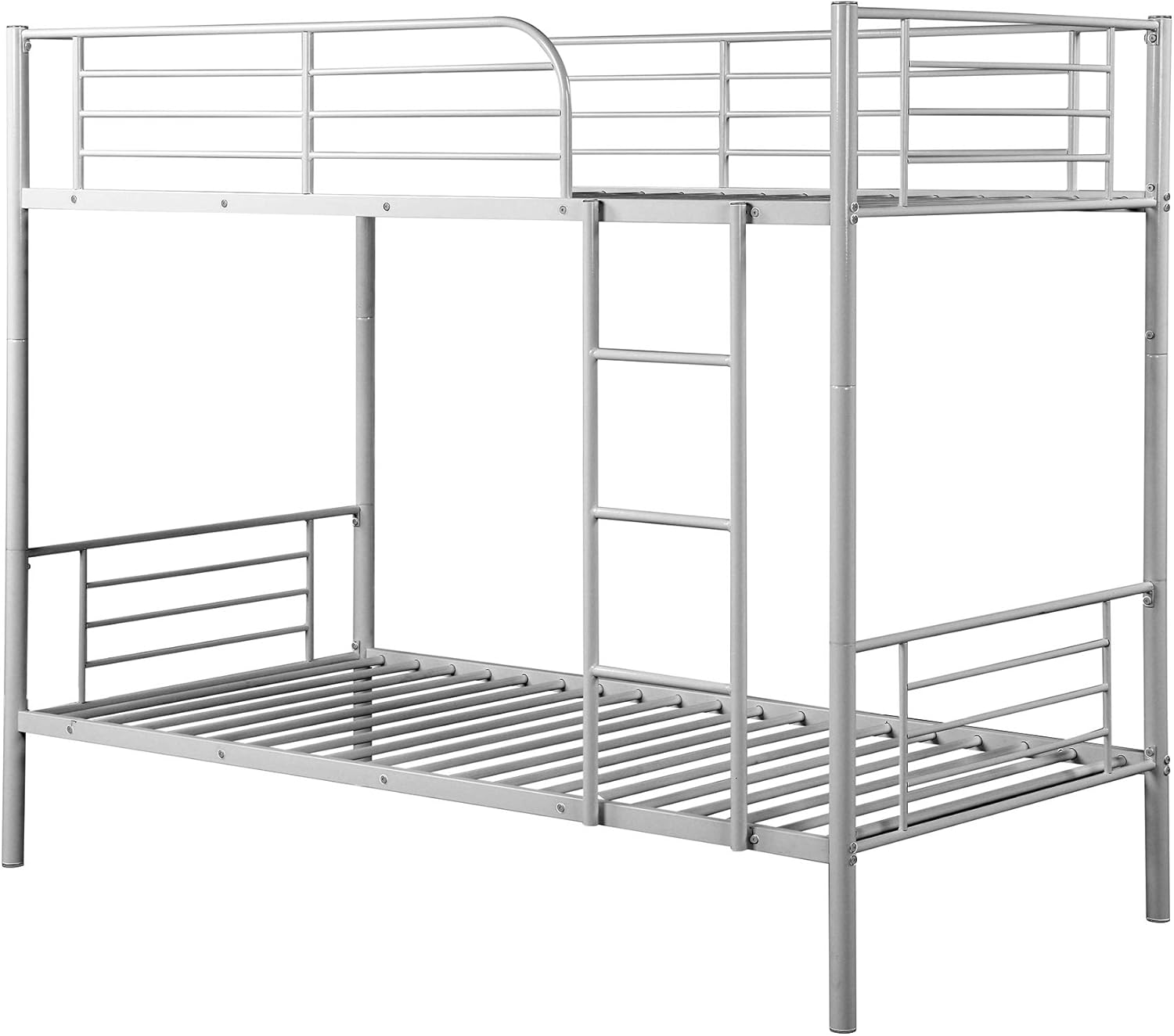 Thanks for shopping with us! Your satisfaction is our greatest motivation. If you have any problems, please feel free to contact us, we will try our best to make you satisfied. The simple yet contemporary Manhattan twin-over-twin bunk bed is a modern classic, featuring a streamlined steel-crafted frame complimented by an eye-catching chrome finish. Manufactured with support you can rely on, the Manhattan bunk bed is constructed with a sturdy Quality Tested steel frame that eliminates excess wobbling while adding solid stability and durability allowing users to sleep soundly.Features:* Attractive powder coated finish in silver color* Contemporary Build With Solid Stability* Save Space or Split Into 2 Beds* Support slats included, No box spring needed* Certified to exceeds all U.S. Government and industry safety standards* Ships ready-to-assemble with necessary hardware, tools and step-by-step instructions* Weight: 84 lbsSpecification:- Upper bunk supports: 220 lbs Lower bunk supports: 220 lbs- Product Dimension: 78.7"L x 42.5"W x 65"H- Weight: 84 lbs- Package dimensions:79"L x 15"W x 6"H- Package Weighrt:86 lds