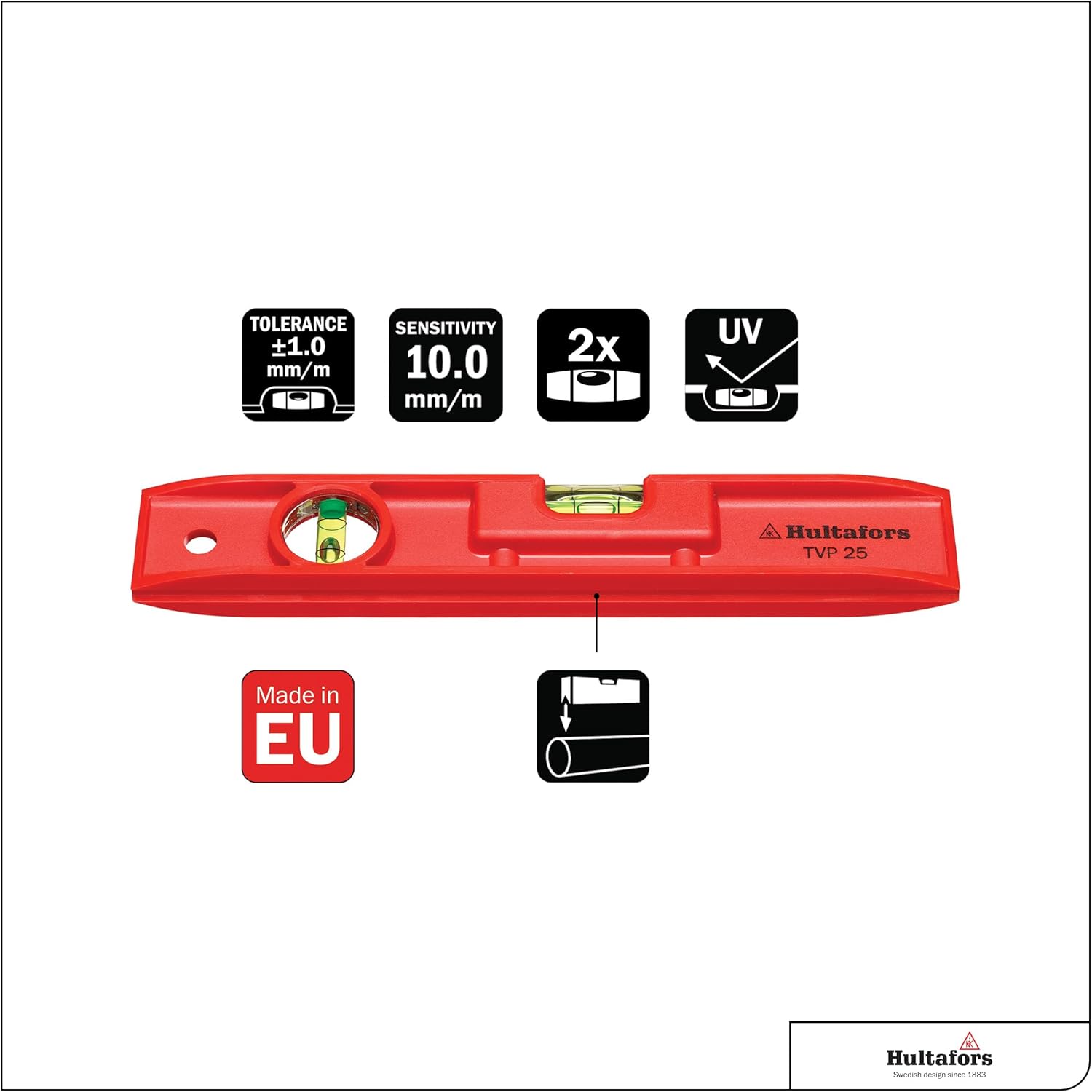 Hultafors Wasserwaage Wasserwaage aus schlagfestem roten Polystyrol für den Einsatz bei Temperaturen zwischen –15 °C und +60 °C. Unzerbrechliche Blocklibellen mit sehr hoher Transparenz und Haltbarkeit. Waagerechtlibelle mit Leuchtbelag. Boden mit V-Nut zur Ausrichtung der Wasserwaage auf Rohren. Libellenradius von 200 mm, was eine Empfindlichkeit von 10 mm/m ergibt. Messtoleranz in Normallage ±1,0 mm/m.LieferumfangHultafors Wasserwaage