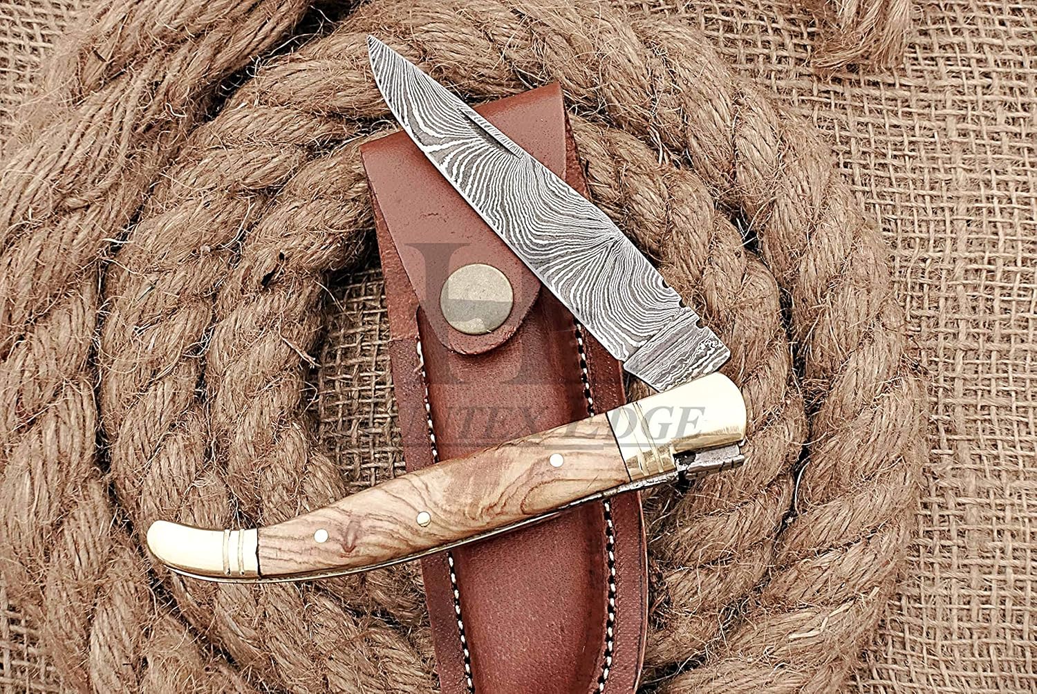 This knife is totally Time Honored, Handmade, Handcrafted by our Craftsmen. Its a Top Quality Practical Knife and deals best in Camping, Hunting, Fishing, Survival, Tactical, Combat, Collection & Everyday use Product Type : Custom Handmade Damascus Hunting Folding Pocket French Lagouli Knife Blade Type : Straight Back Blade Edge : Razor Sharp Knife Length : 4 Inch Blade Length : 3.7 Inch Handle Length : 4 Inch Blade Thickness : 3 mm Blade Hardness : 58-60 HRC Blade Pattern : Twist Blade Material : Damascus Steel Blade Lock type : Slip Joint Handle Material : High Polished Natural Olive Wood Scales with Brass Pins & Brass Bolsters File Work : Blade Spine & Tang is Gorgeously Hand File Worked Accessory : Genuine Bull's Leather Pouch Package : 1 x Knife with Leather Pouch The Damascus Steel : Our Damascus Steel is made of by forging 256 folded layers of 1095 Steel and 15N20 High and Low Carbon Steel. Blade has been given an excellent heat treatment to get it well hardened. Blade has hardness 58-60 HRC which holds the sharp edge for long time. It is forged in a specific way to achieve high hardness, beautiful & unique blade patterns. We have different patterns available in Damascus Steel like Twist, Ladder, Rain Drop, Straight, Flame, Mosaic, Cross, Star, Feather etc. The Leather Pouch : Knife comes with 100% Genuine Fine Quality Extra Thick Bull Hide Utility Leather Pouch. The leather pouch is completely hand tooled and sewn. The pouch can be worn on belt. Knife Care : Damascus steel as well as 1075 high carbon steel knives are different than other steel knives, because of its high carbon content they can be rusted if not care properly. Never store knife for long time in Pouch. Leather can absorb moisture which will rust the knife. Always clean the blade after using and apply oil/wax before storing it, for its longer life