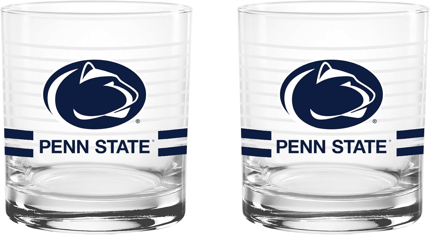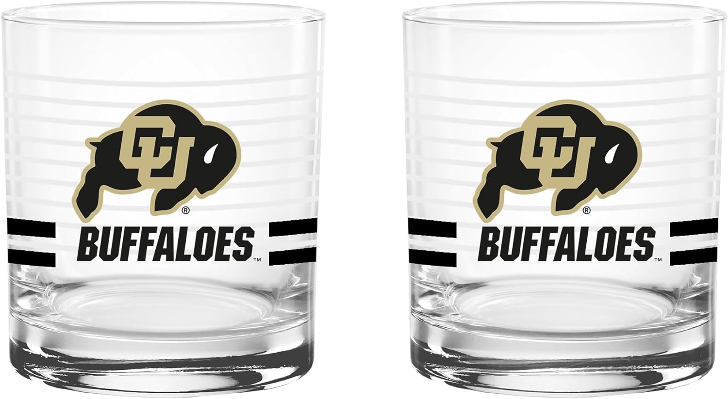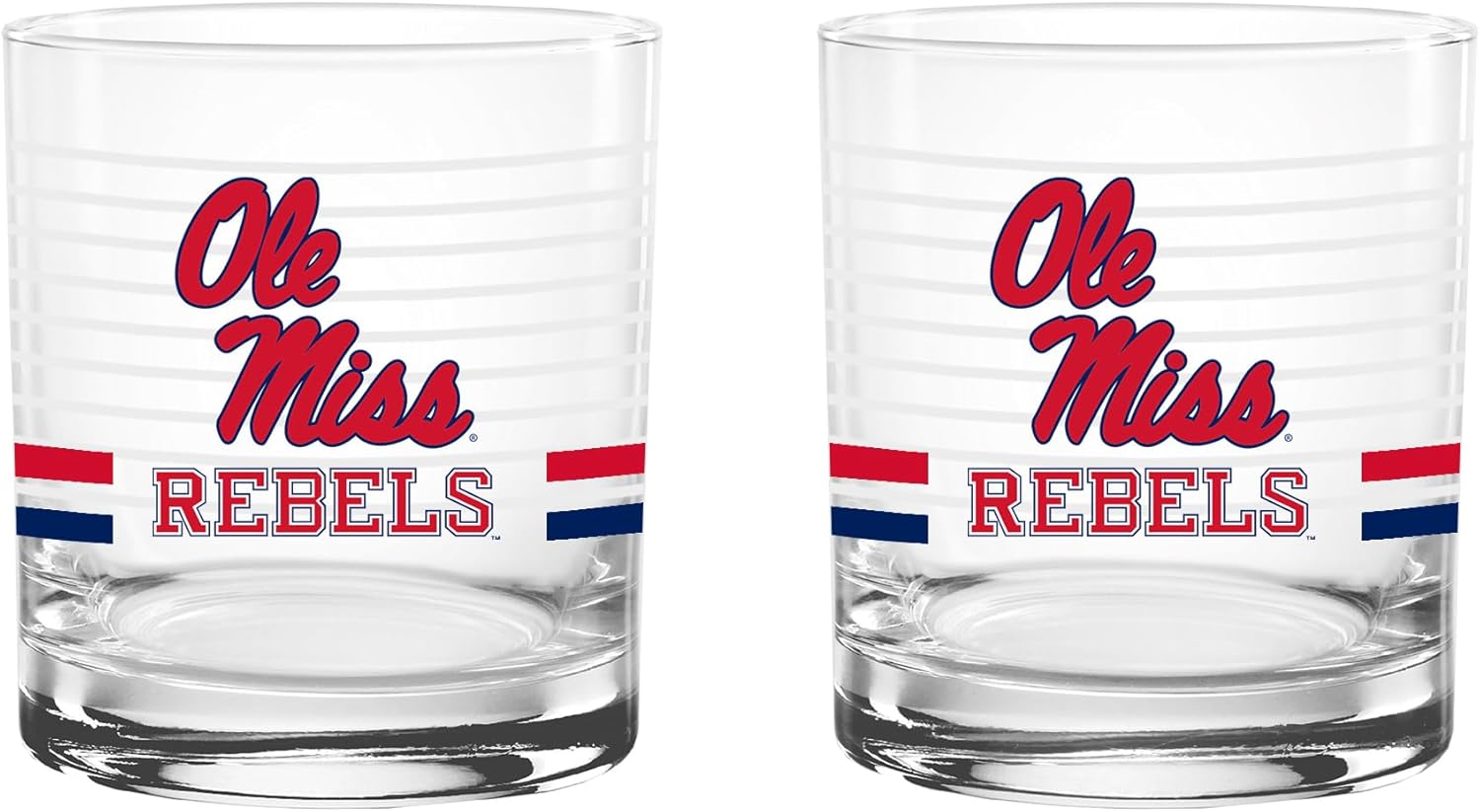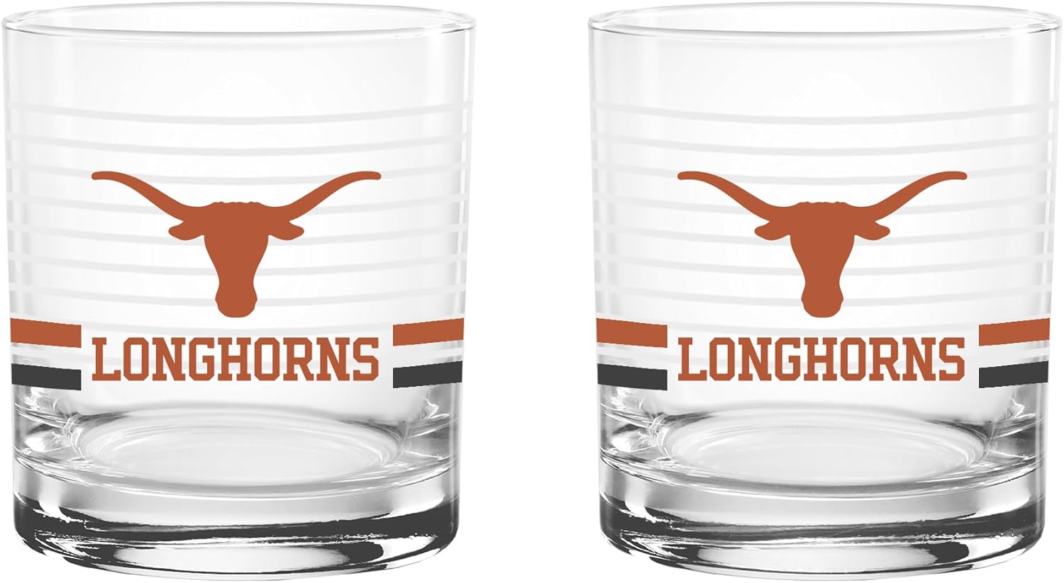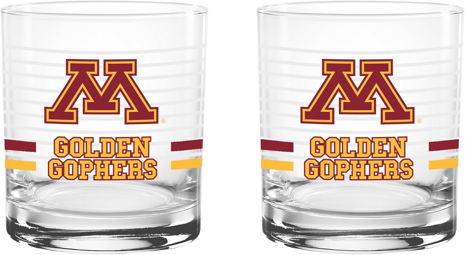 This officially licensed collegiate 14 oz rocks glass set combines classic barware style with bold school spirit. Made in the USA from high-quality glass, each glass features a ring line design, a vibrant team-colored logo, and coordinating team color stripes that proudly represent your favorite school. The 14 oz rocks glass silhouette offers a sturdy base and comfortable feel, making it perfect for serving whiskey, cocktails, soda, or any favorite beverage. Its timeless design adds a stylish touch to any home bar while showing off your team pride. Ideal for game days, tailgates, alumni gatherings, or everyday use, this two-pack set makes a great addition to any fan collection and a perfect gift for students, alumni, and dedicated supporters.