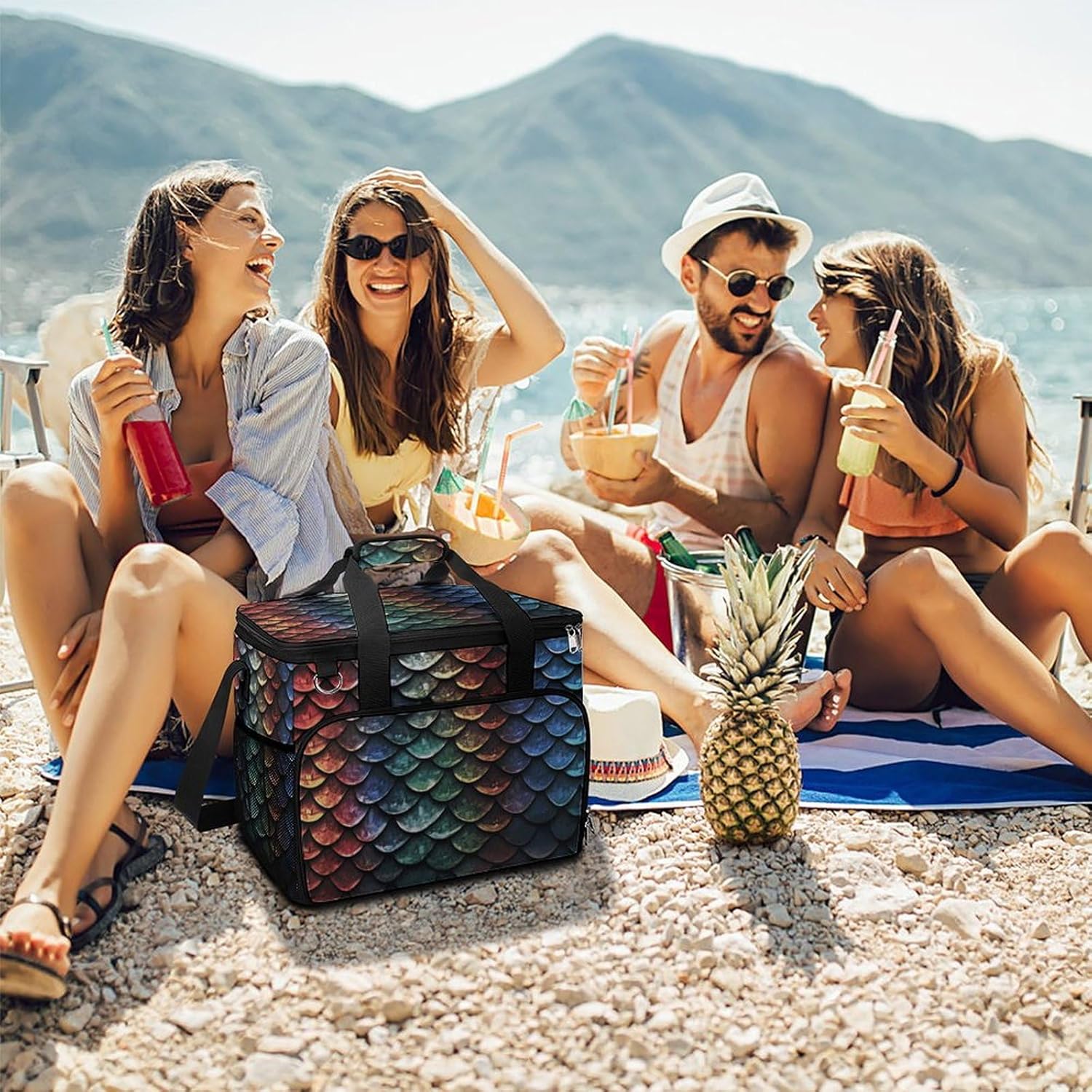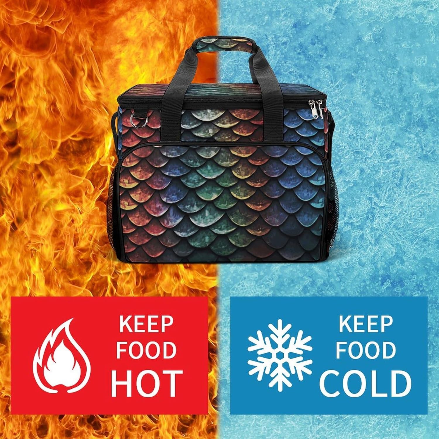 Take Your Meals Anywhere with Dragon Scale Grocery BagsFood Container Carrier Oxford Fabric Picnic Bag Heat Retaining Food Bag Camping Cooler BBQ Accessories Cute Picnic Bag with Pockets Insulated Food Bag for Work Insulated Lunch Tote Bag Camping BagTemperature Control That WorksThe upgraded aluminum foil lining creates an effective thermal barrier. Your drinks stay refreshingly cold, and your hot dishes maintain their warmth for hours. No more lukewarm meals during outdoor outings.Thoughtful Storage DesignTwo side mesh pockets - Perfect for water bottles or umbrellasFront zippered pocket - Keeps keys, phone, or condiments organizedInternal mesh pocket - Stores utensils, napkins, and small essentialsMain compartment - Spacious enough for food containers and snacksBuilt for Daily AdventuresConstructed from high-density oxford fabric with reinforced stitching at stress points. The double zippers are sturdy and smooth-operating. Reinforced handles let you carry heavy loads with confidence.Carry Your WayHandles for quick grabbingStands upright for easy packing and accessPerfect For:Picnics in the parkBeach days and pool partiesCamping and hiking tripsOutdoor concerts and festivalsDaily work lunchesGym and fitness classesRoad trips and travelGrocery shoppingSpecifications:Dimensions: 15.4 x 11.8 x 11.8 inchesMaterial: High-density Oxford fabricLining: Aluminum foil (insulated)Closure: Sturdy double zippersPockets: 2 side mesh, 1 front zipper, 1 internal meshCare: Hand wash or machine wash, do not bleachNote: Food containers and utensils shown in images are not included.