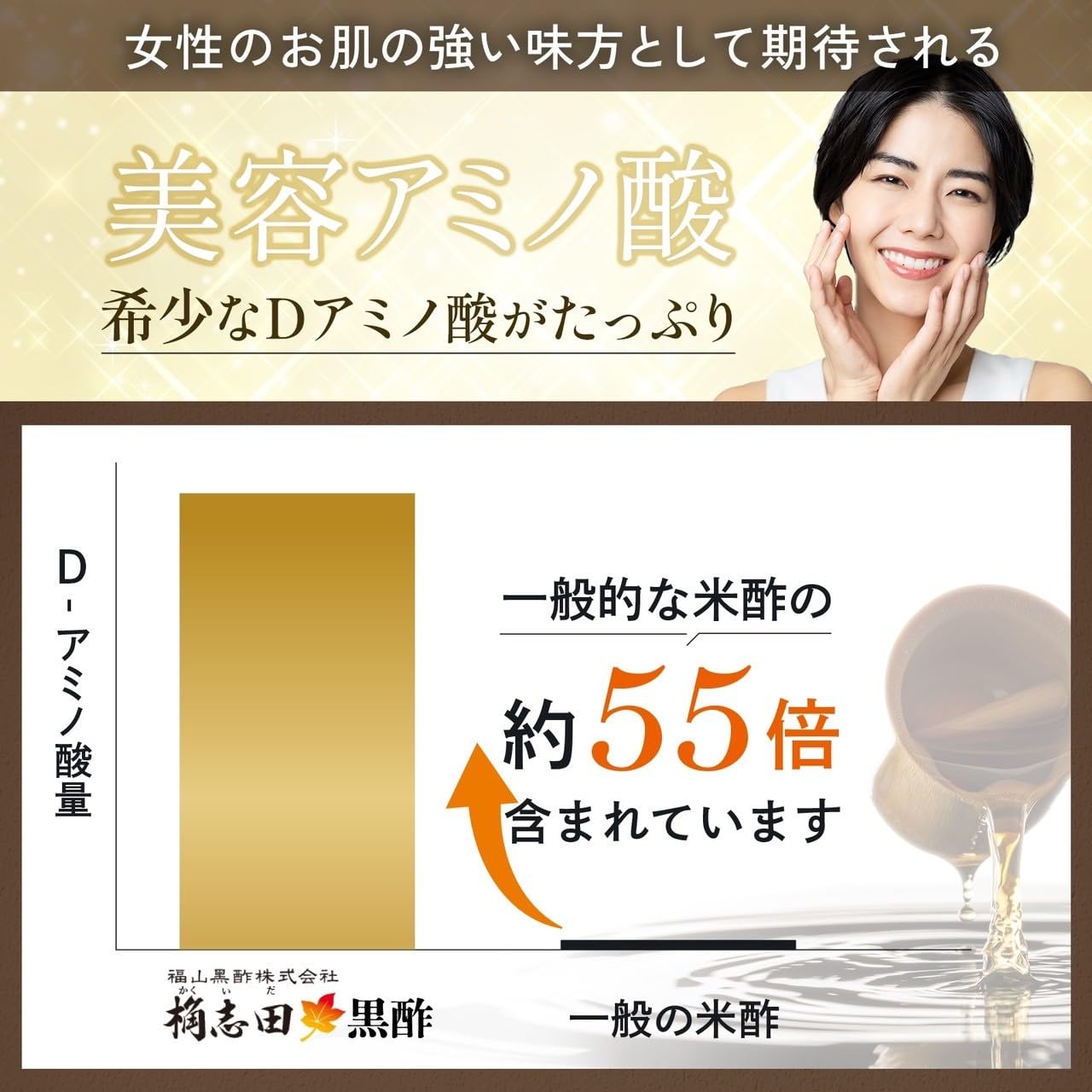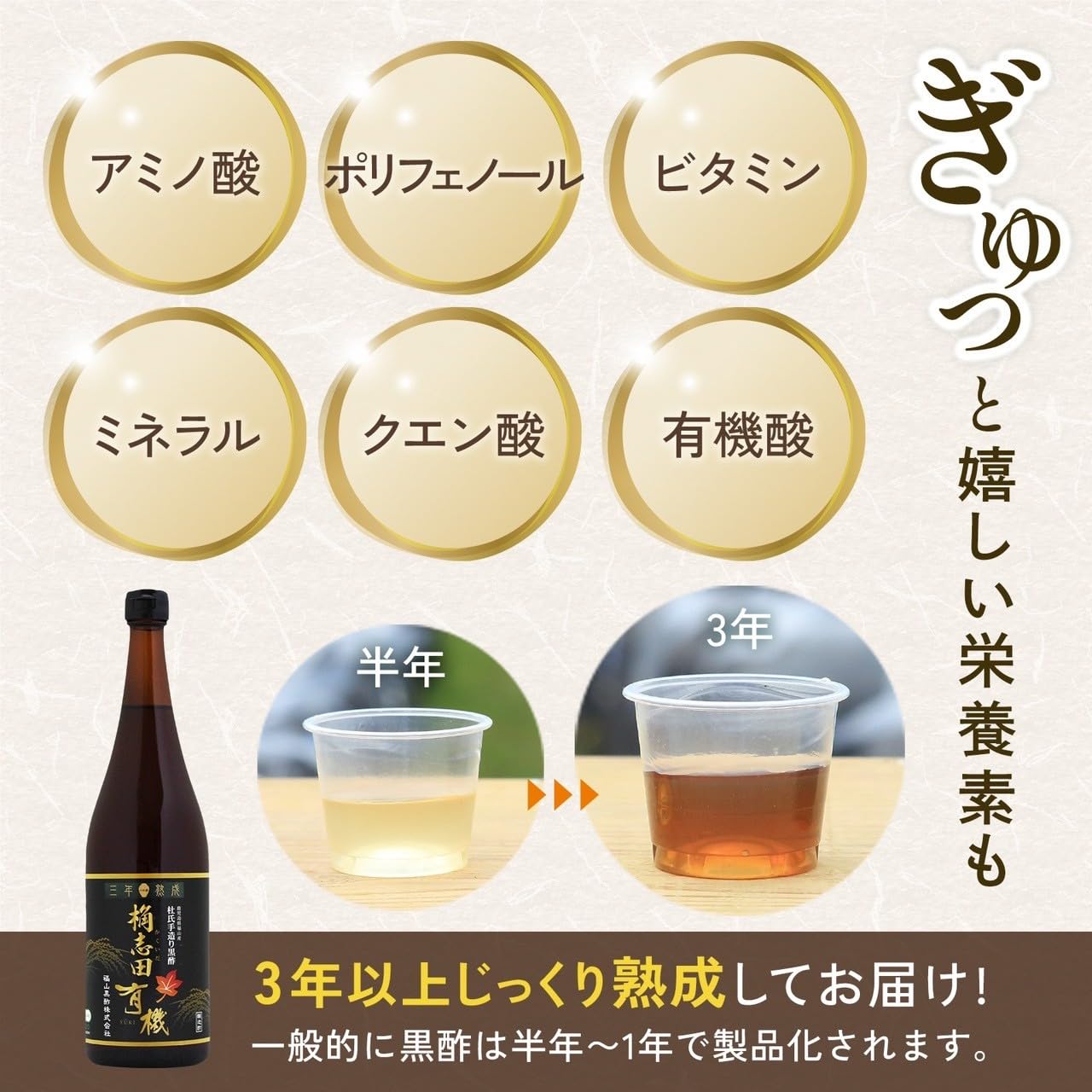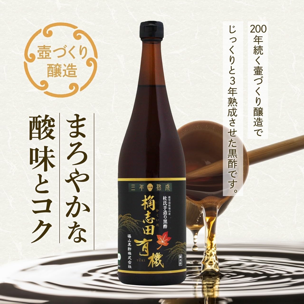 INGREDIENTS: Organic Brown Rice, Water Kakuida's black vinegar has been made for more than 200 years by a traditional process. This organic brown rice black vinegar is aged over 3 years, and 23.34 FL OZ (720 ml). 48 servings (per 15ml). The acetic acid is abundant in the Kakuida's black vinegar, which is absorbed into the body, and a substance called adenosine is produced. Adenosine then goes on to act beneficially on the blood vessels and blood pressure. Other amino acids are present in the vinegar, which are very beneficial to a body. The maturation process occurs in the specially designed vinegar jars, increasing the mellowness and amino acid contents.