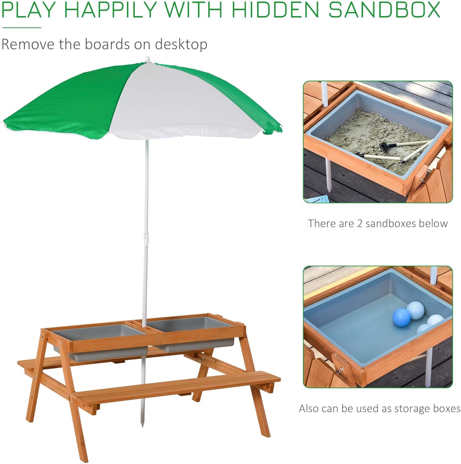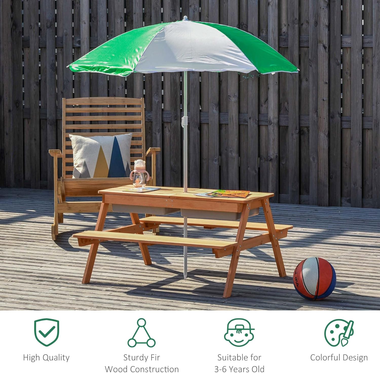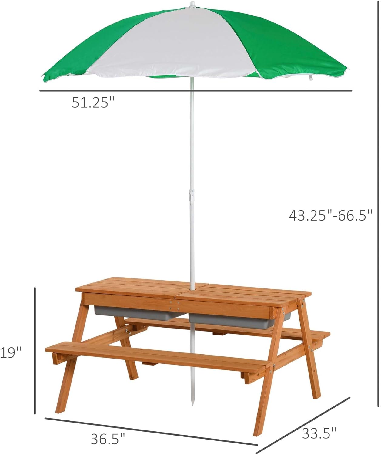 Q: Want a kids’ table that does more than just hold snacks?Our kids picnic table with umbrella has removable tabletop boards that reveal storage space doubling as a sandbox; it works as both a seating spot and an activity center; it lets kids play and sit in one convenient place, making it perfect for messy play and casual meals.Q: Worried about your kids getting too much sun during outdoor play?This kids outdoor table comes with a 6-rib umbrella; it provides cool shade for meals, games, and activities; it reduces sun exposure for little ones; the umbrella is removable, foldable, and height-adjustable, so you can customize shade for any time of day.Q: Tired of flimsy kids’ furniture that breaks after rough use?This kids picnic tables for outdoors is made of solid fir wood; it offers a stable area for play and meals; it stays strong and reliable through daily rough use; it’s built to last for years, even with active kids.Q: Need a dedicated outdoor spot just for your kids?This kids outdoor furniture gives them their own space for playtime and snack time; it works great in gardens, backyards, and at the beach; it creates a fun, kid-sized spot for all their favorite outdoor activities.Q: Looking for a table that fits your space and your kids’ age?This kids outdoor table and chairs has overall dimensions of 36.5" L x 33.5" W x 19" H without the umbrella; it measures 51.25" L x 43.25"-66.5" H with the sun umbrella; it’s suitable for kids aged 3 to 6 years old, making it the perfect fit for growing little ones.