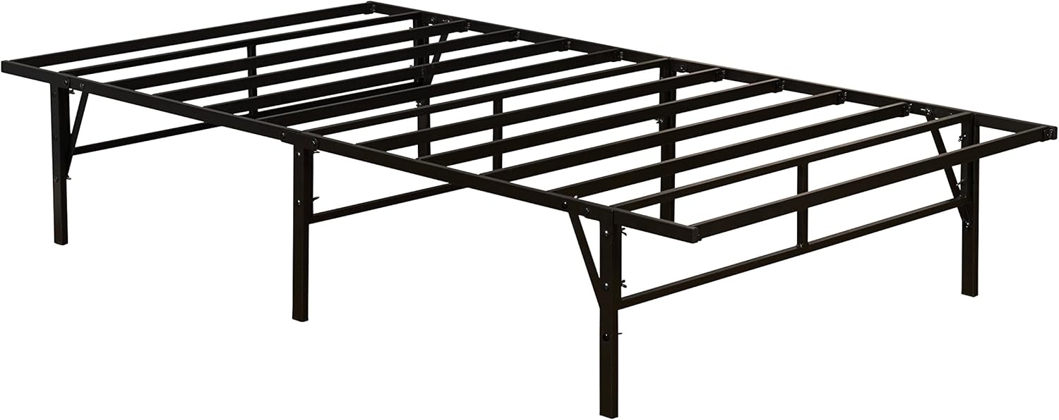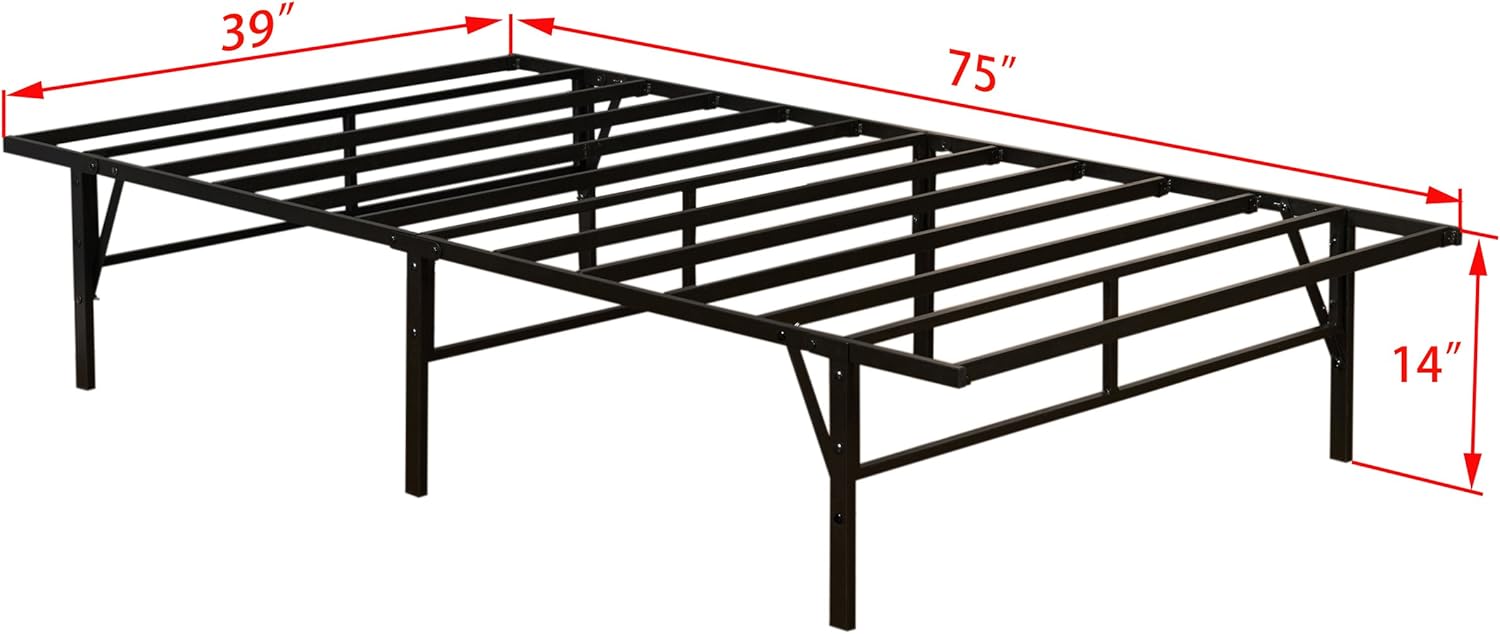 Kings Brand Furniture Platform Bed Frame Mattress Foundation / Box Spring Replacement, Twin. Features a sturdy steel platform design that provides maximum support for any kind of mattress. 14" high, provides great underbred storage space and makes cleaning easy. Dimensions: 75''W x 40''D x 14''H. Simple assembly required.