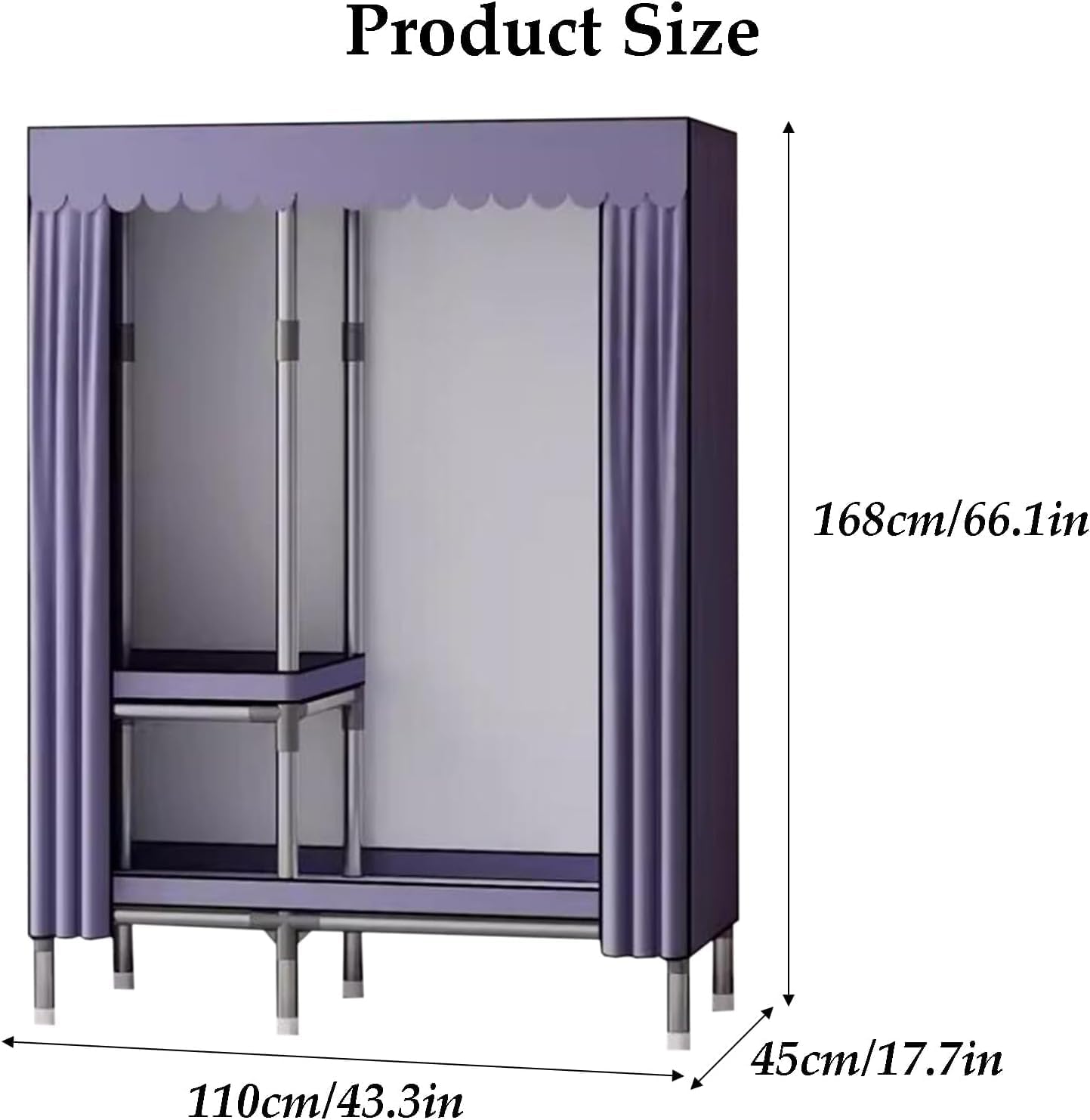 Feature: our wardrobe it provides load capability to ensure sturdier and more stable, not be bent easily, will prove to be sturdy and works for years. That creates a spacious space for for bedroom,to meet your long term and all aspect storage need. product name: closet/portable closet/clothes closet/portable closets/wardrobe closet/portable wardrobe Product material: iron alloy Facing material: cloth Product color styles: Purple gray pattern (A), dark purple (B), dark blue pattern (C), yellow + green pattern (D) Product length size (L): 70cm/27.6in, 110cm/43.3in, 130cm/51.2in, 150cm/59.1in, 180cm/70.9in, 230cm/90.6in Product width size (W): 45cm/17.7in Product height size (H): 168cm/66.1in Packaging size approx (LxWxH): 80x50x20cm/31.5x19.7x7.9in Product weight approximately: 8-20kg/17.6-44.1lb Opening and closing method: push-pull sliding door Whether to assemble: Assemble Packing list: 1 X closets