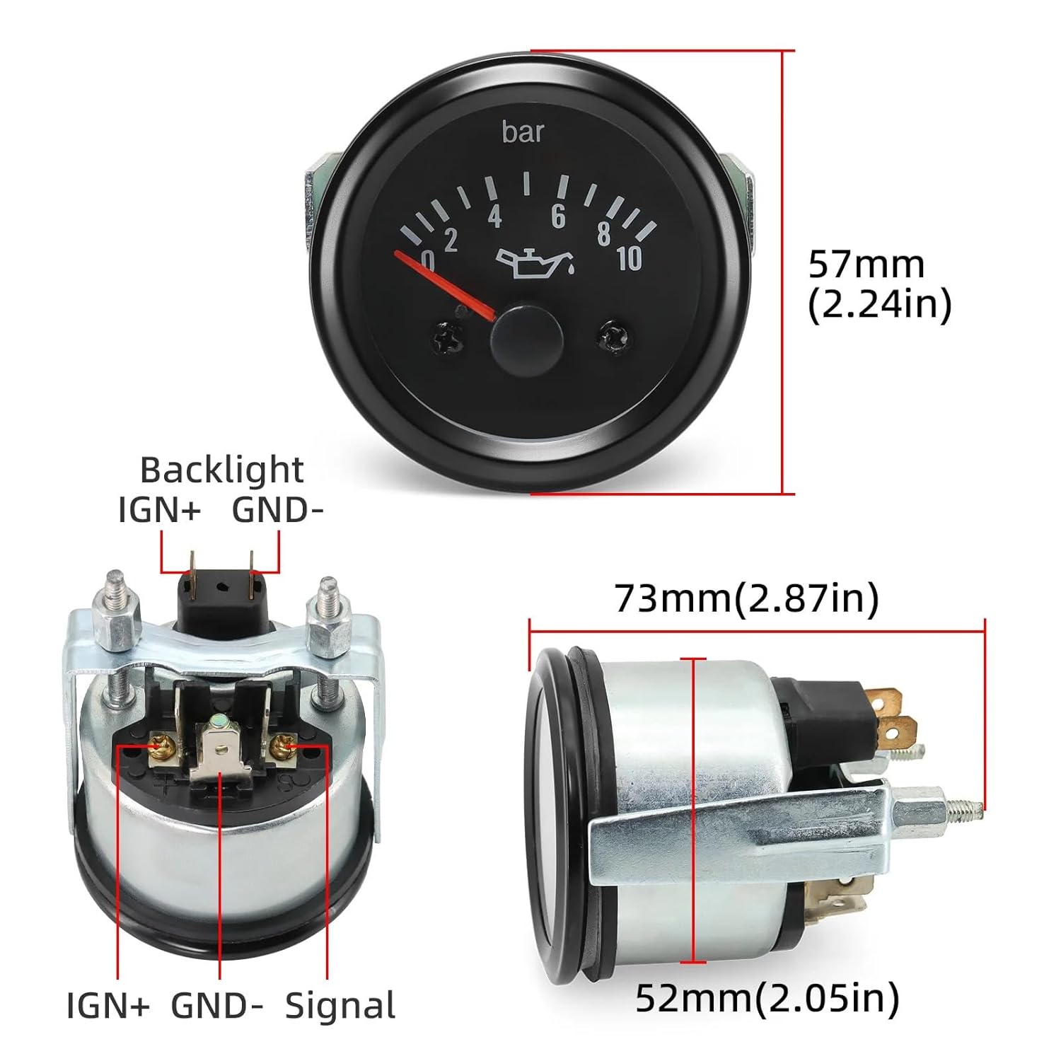 Feature:- work on Engine DC24V- Oil Pressure Gauge: 0-10 Bar- 52mm car GaugePackage: 1PCS Manufacturer Part Number : 52mm GaugeItem Weight : 135gPackaging: 1 pcs