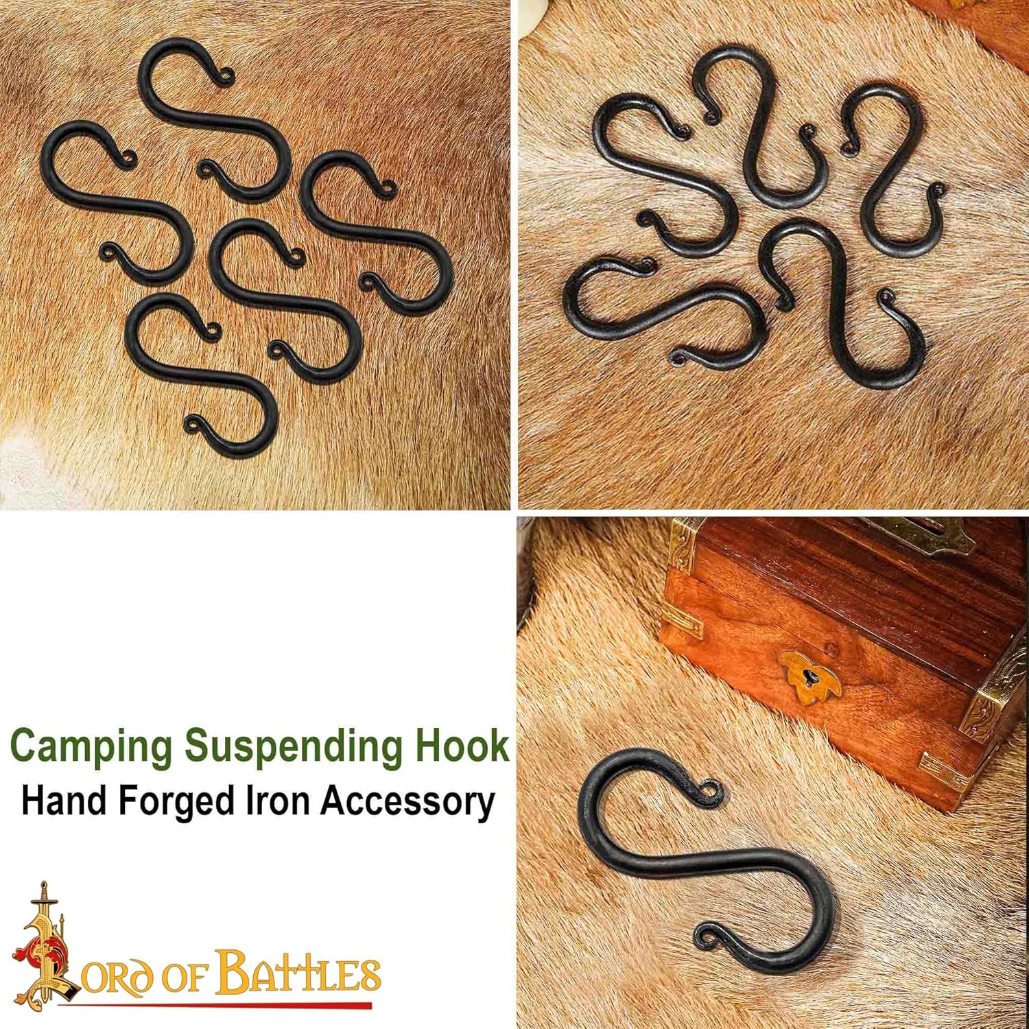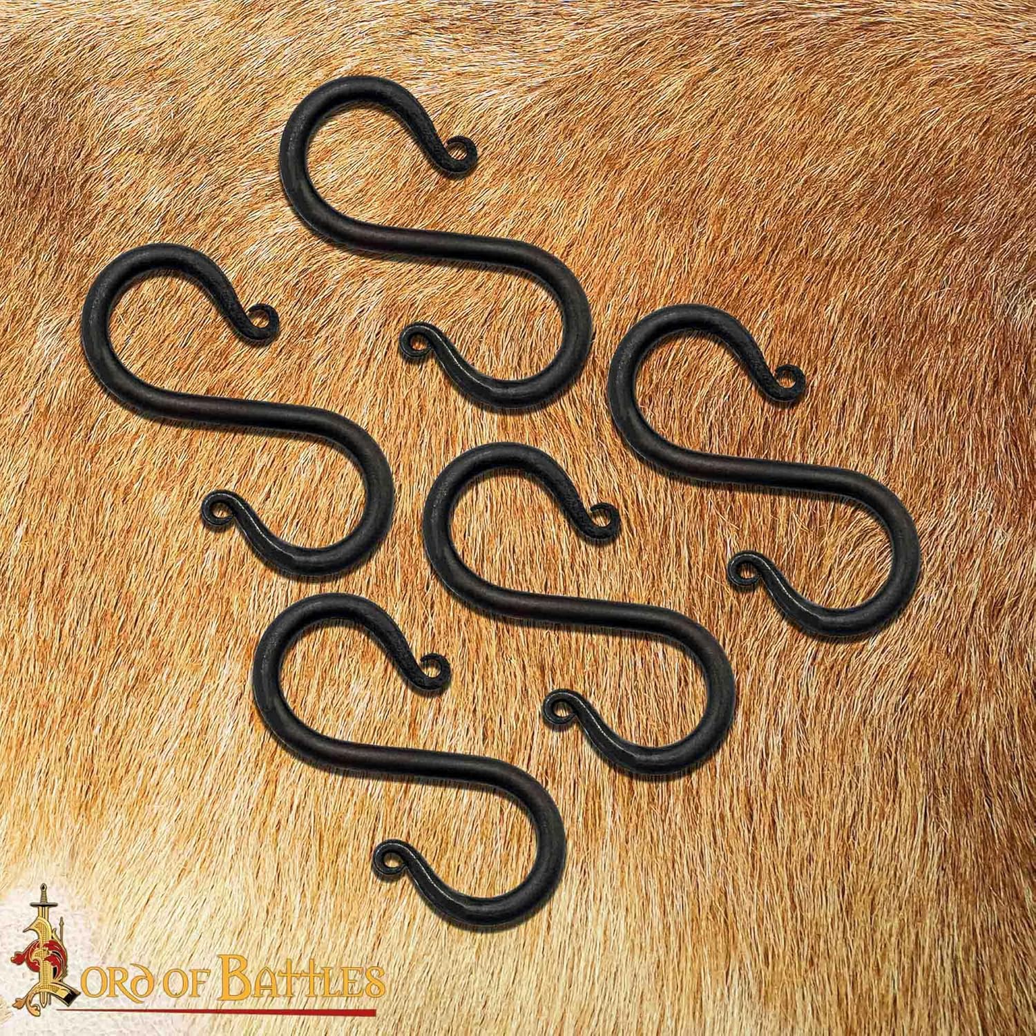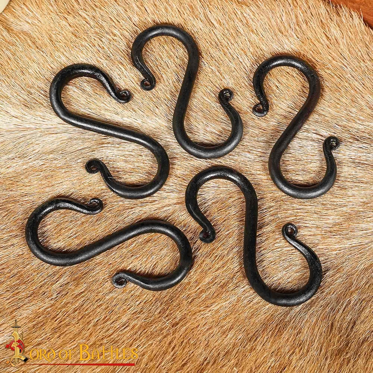 This product consists of a set of hand forged iron S-shaped hooks for hanging and organizing items in medieval-style, rustic, or practical places. These hooks are intended for general hanging use and decorative applications and are not supplied with load ratings. Each hook is made from iron and shaped using forging. The S-shaped design allows items to be hung quickly and removed easily without the need for fasteners or tools. Natural variations in shape and surface texture may occur as part of the hand-forging process. The hooks are finished with a black protective coating that helps reduce oxidation and provides a rustic appearance. This finish is suitable for indoor use and sheltered outdoor environments when basic care is followed. Two size options are included to suit different hanging needs. The smaller size measures approximately 1 3/4 in × 3 1/8 in (4.5 × 8 cm), while the larger size measures approximately 2 3/8 in × 4 3/4 in (6 × 12 cm). The set includes 10 hooks, allowing use across multiple areas. These S hooks may be used for hanging cookware, lanterns, mugs, utensils, tools, bags, towels, or decorative items in kitchens, camping setups, gardens, workshops, or medieval-inspired living spaces.