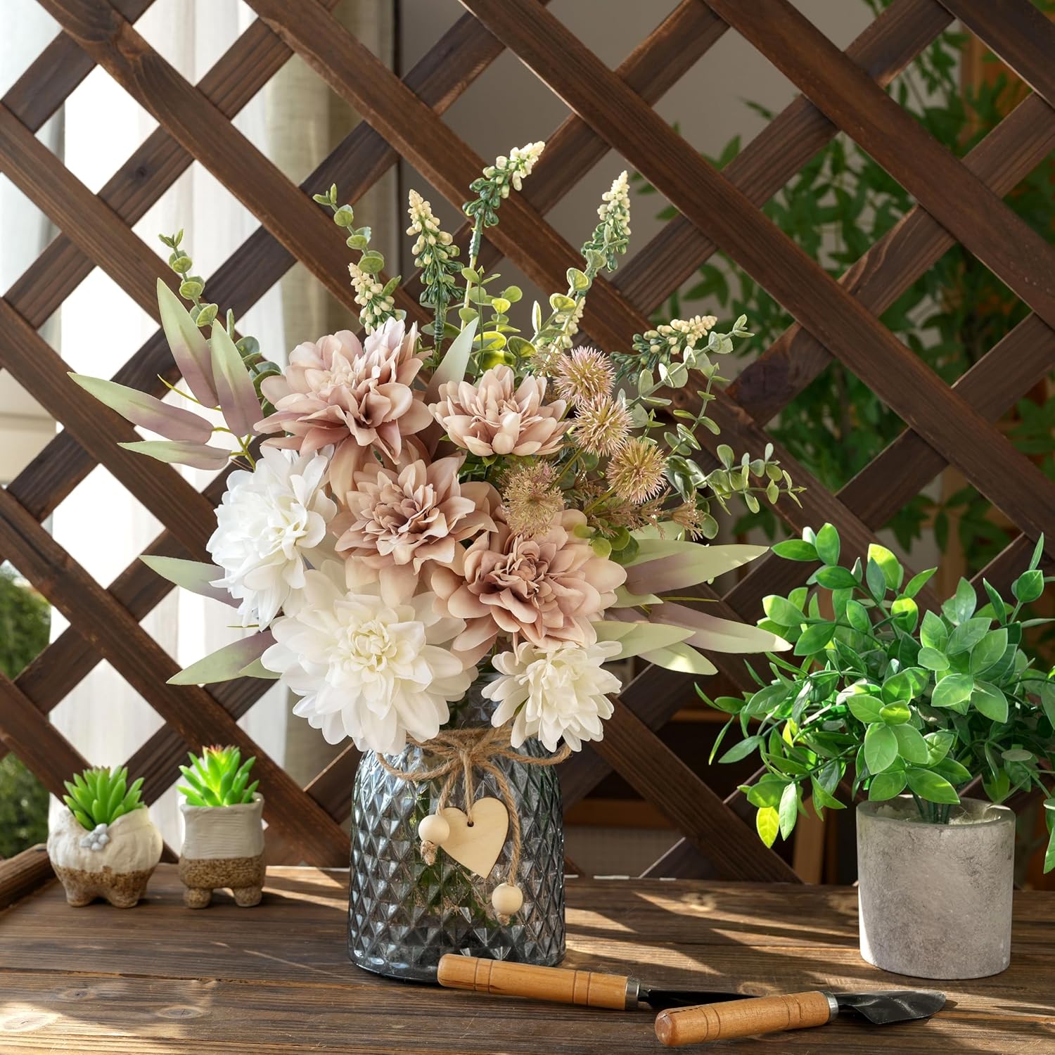 Enhance your home décor with the soft romantic beauty of this Artificial Dusty Pink Dahlia Flower Arrangement with Decorative Vase. Featuring full and layered dahlia blooms in elegant muted pink tones, this floral centerpiece brings warmth, sophistication, and timeless charm to any space. The flowers are carefully arranged in a stylish vase that complements a wide range of décor styles including farmhouse, modern, cottage, and traditional interiors. The dusty pink color palette creates a calming yet elegant decorative accent suitable for both seasonal displays and everyday styling. Made from durable, high-quality artificial materials, this faux flower arrangement maintains its fresh and vibrant appearance without watering or maintenance. Perfect for coffee tables, dining rooms, bedrooms, entryways, or office décor, it instantly adds softness and refined floral beauty to your living space. Whether used as seasonal decoration or a thoughtful gift, this dusty pink dahlia arrangement delivers long-lasting elegance and natural-inspired décor appeal.