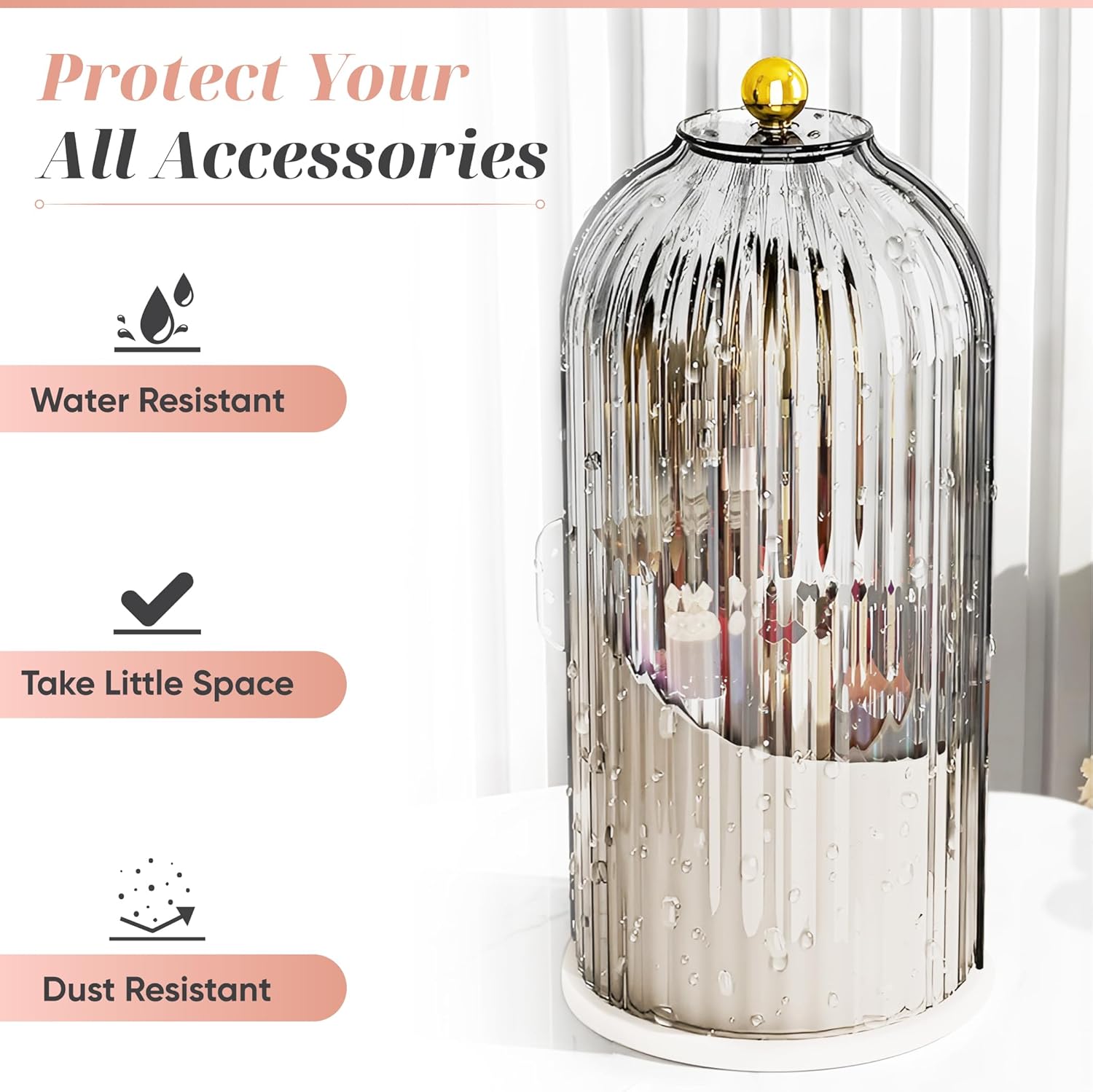 The makeup brush holder is a stylish and functional addition to any vanity, offering a sleek, contemporary design that enhances your decor while providing practical organization. With a 360-degree rotating base, the holder allows for smooth, silent access to all sides, making it easy to retrieve any item without moving the entire unit. The generous 5-compartment design is perfect for organizing a wide variety of makeup essentials, including brushes, lipsticks, eyeliners, mascaras, and more. Each compartment offers ample space to keep your daily use items neatly arranged and readily accessible.The holder is both waterproof and dustproof, featuring a design that resists spills and prevents dust accumulation, ensuring that your makeup tools stay clean and hygienic. Its smooth, non-porous surfaces are easy to clean—simply wipe down with a damp cloth or mild cleaner for hassle-free maintenance. Additionally, the holder includes anti-slip pads on the bottom, which provide stability and prevent movement, keeping it securely in place and protecting your surfaces from scratches.Lightweight and travel-friendly, this makeup brush holder is easy to carry in your luggage, making it ideal for on-the-go use. Whether at home or traveling, its combination of style, functionality, and convenience makes it a must-have accessory for organizing your makeup collection efficiently.