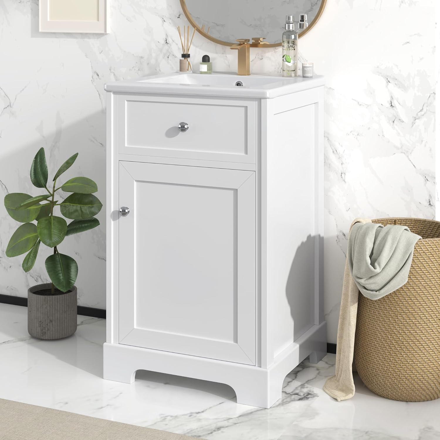 Bullet Point1. 20" Bathroom Vanity with Sink2. Solid Wood & High-quality MDF Board & Ceramic Sink & Painted Finish3. Cabinet with Door Shelf4. One PackageDetails1. Functional Storage Cabinet and Shelf2. Silver Round Knobs3. Stainless Steel Hinges