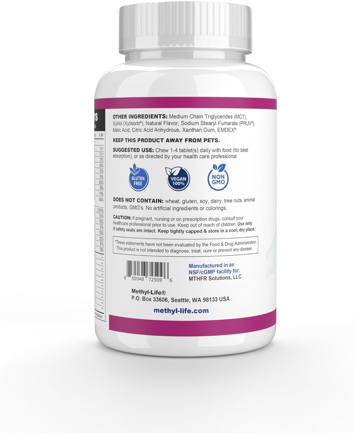 When it comes to multivitamins, one size doesn’t fit all - especially if your body needs nutrients in their active, methylated form. That’s why we created Methyl-Life Methylated Multivitamin, a chewable daily multi designed with precision, purity, and breakthrough effectiveness in mind.At the heart of this formula is Cerebrofolate, one of the most stable and bioavailable forms of L-Methylfolate (5-MTHF). Unlike synthetic folic acid, Cerebrofolate is already in the most active folate form your body can use immediately - making it a smarter, more efficient choice for nutritional support. We’ve paired it with Hydroxy B12 and a carefully balanced blend of vitamins, minerals and micronutrients to uplevel your daily essentials.Why chewable? Because wellness should be simple. Our tablets are smooth, tasty, easy to take, and refreshingly straightforward - no water required, no capsules to struggle with. They’re also vegan, Non-GMO, and free from gluten, dairy, soy, the top 14 EU allergens and artificial colors, making them a great fit for diverse lifestyles and dietary needs.We believe transparency matters. That’s why every bottle is crafted in the USA under strict NSF-certified and cGMP standards, with each batch tested by third parties for purity, potency, and consistency. You’ll never find hidden fillers, unnecessary additives, or overcomplicated blends - just clean nutrition you can rely on day after day.Perfect for adults and children alike, this multivitamin is designed to complement your wellness journey - whether you’re maintaining healthy habits, seeking clean nutritional support or simply upgrading from a generic daily multi because you need something truly effective. With Methyl-Life, you’re not just checking a box - you’re choosing a formula that respects your body, your standards, and your greater goals.Take the smarter approach to daily nutrition. Add Methyl-Life Methylated Multivitamin to your cart today and experience the power of clean, active nutrients that reliably support - one chewable tablet at a time.These statements have not been evaluated by the Food and Drug Administration. This product is not intended to diagnose, treat, cure, or prevent any disease.