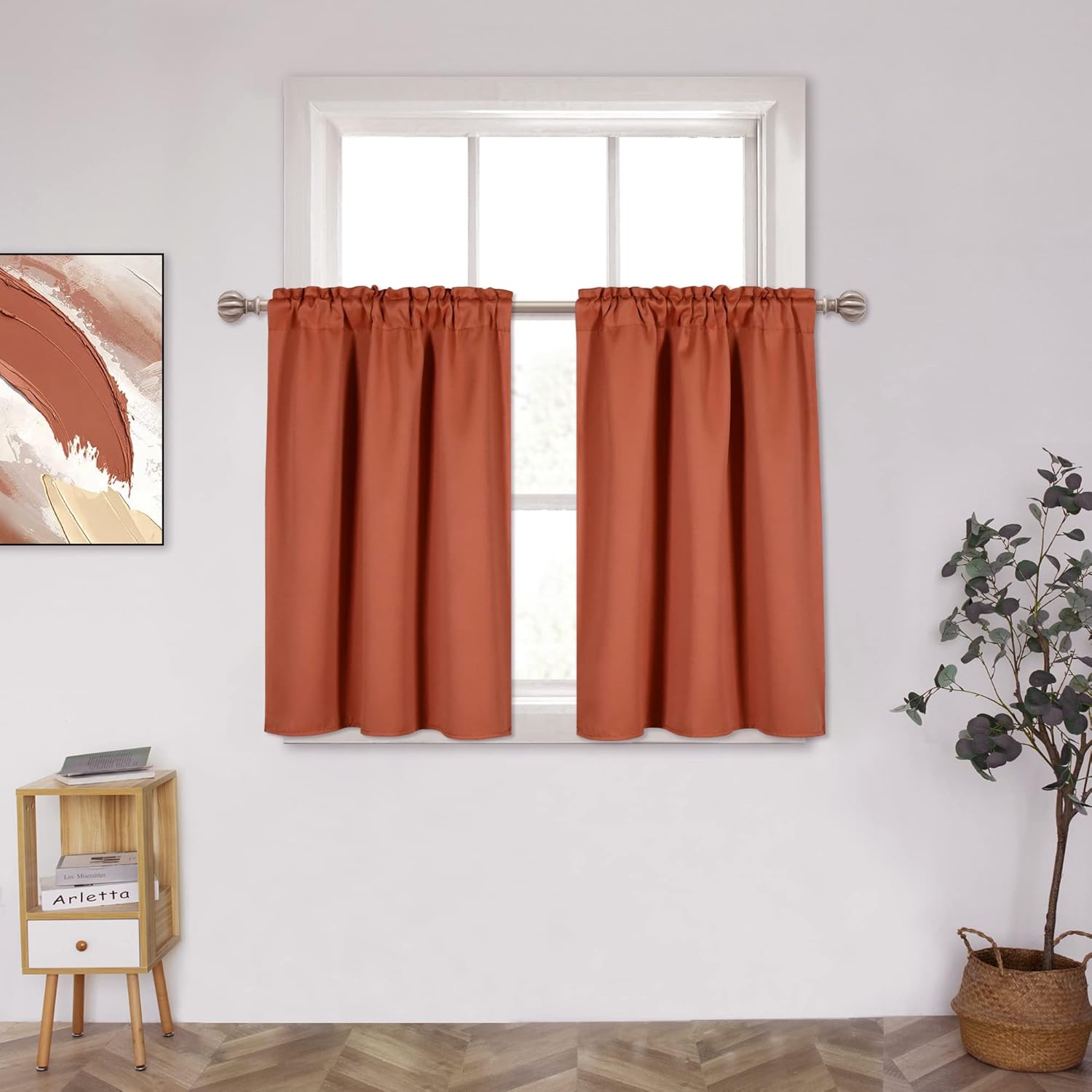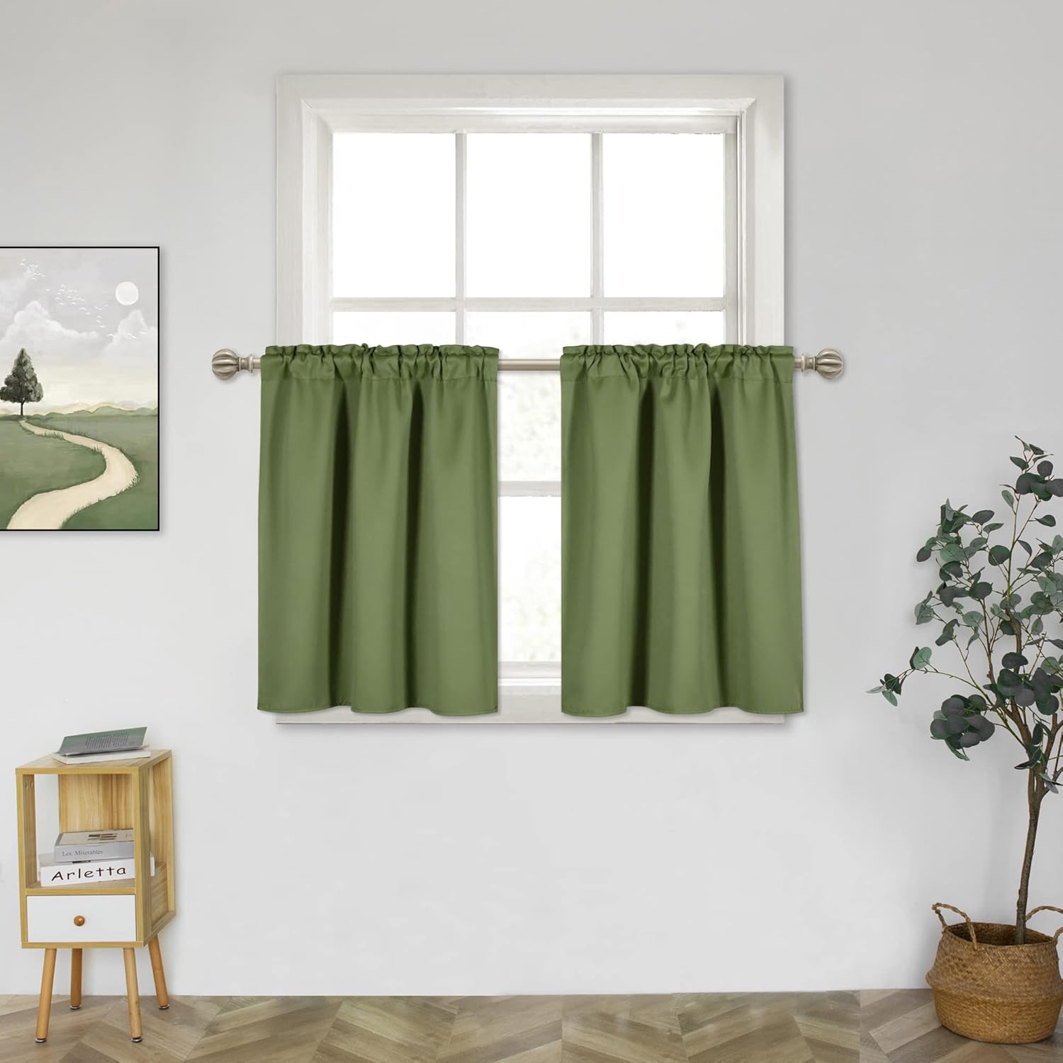BASIC INFORMATION - Package contains 2 panels. Each panel measures 29" width by 24" length. 3" Rod pocket with 0.8" header opens at the top of each panel. Can fit most of curtain rods.FABRIC & BLACKOUT - This solid tiers curtain features a smooth and elegant fabric with a nice touch and a beautiful drape. And made of quality blackout fabric which can block 85-99% sun lights and UV rays (darker color works better).FUNCTION CURTAINS - This thermal insulated curtain can provide privacy while blocking sunlight, balance temperature by insulating against heat and reduce outside noise.FLEXIBLE CURTAINS - This small curtain is suitable for any small window and narrow place that needs to be covered.Most customers use it in the kitchen as half curtain, which can beautify the kitchen windows. You can also use it in cabinet, bedrooms, living rooms, storerooms, bathrooms, basements and anywhere where small curtains are needed.EASY CARE - Machine washable below 86℉. Gentle cycle. Do not bleach. Tumble dry low. Warm iron.