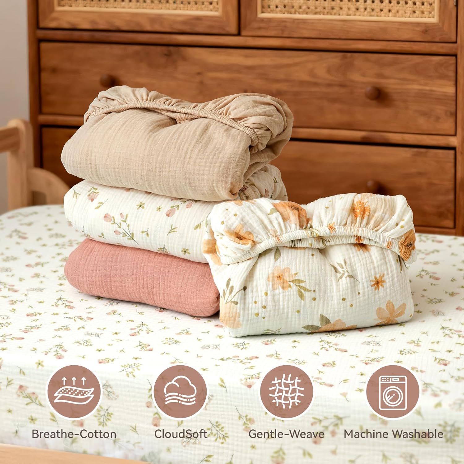 Boho 4-Piece Crib Sheet Set - Premium Muslin CottonWHY PARENTS CHOOSE OUR CRIB SHEETSSTYLE MEETS FUNCTIONTransform your nursery with sheets that are as beautiful as they are practical. The coordinating boho designs create a serene, stylish space for your baby to rest and grow.PEACE OF MIND SAFETYFrom the secure elastic fit that prevents bunching to the breathable fabric that reduces overheating risk, every detail is designed with your baby's safety and comfort in mind.GIFT-READY PERFECTIONUnlike single sheets or mismatched sets, our thoughtfully curated 3-piece collection arrives ready to use and ready to impress—taking the guesswork out of finding that perfect baby gift.GROWING WITH YOUR BABYFrom crib to toddler bed, these sheets adapt to your child's changing needs. The durable construction ensures they'll remain soft and vibrant through years of use, even with frequent washing.IDEAL FOR: New parents setting up their first nursery Parents transitioning from swaddles to crib sleeping Grandparents keeping a cozy sleep space at their home Childcare centers needing durable, washable bedding Anyone seeking a practical yet beautiful baby giftAdd both style and substance to your nursery with the Boho 4-Piece Crib Sheet Set—where safety, comfort, and design come together perfectly.SPECIFICATIONS Material: 100% Premium Muslin Cotton Set Includes: 3 Fitted Crib Sheets (1 of each design) Mattress Fit: Standard 52"" × 28"" crib/toddler beds, 3-8"" thickness Care Instructions: Machine wash cold with similar colors, tumble dry low Safety Features: Rounded corners, breathable muslin cotton, non-toxic materials Design Style: 1 solid pink + 1 solid light brown + 1 small floral + 1 daisy