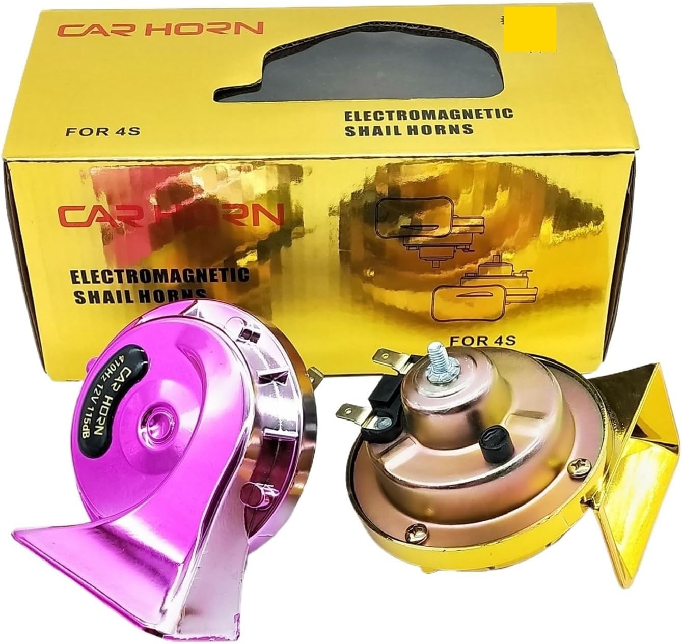 Type: Car snail HornModel: Luxury Gold snail HornType: Snail HornApplicable models: UniversalColor: Local gold, rose gold, silver, blue, redPower supply voltage: 12Power: 50Impedance: 8Sound level: 110Current: 8Voltage: 12Applicable model: Universal