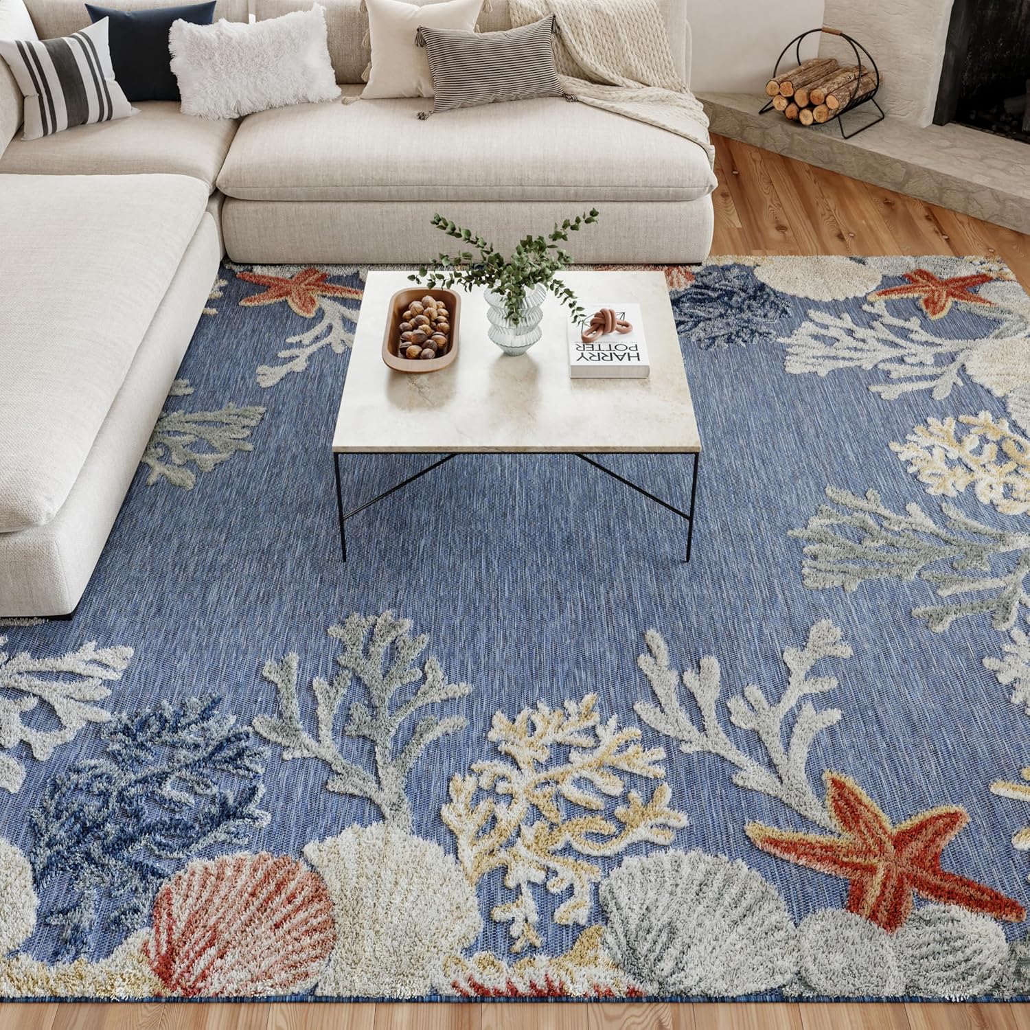 Bring bold style to any setting, indoors or out with the Suncoast collection. These indoor/outdoor rugs showcase bold, oversized designs that transform conversational areas into tropical escapes. Made from 100% polypropylene with a flat construction and soft-cut textural patterns. Add a touch of seaside charm to your space with this indoor/outdoor rug from the Suncoast collection. Multicolored coral and shell motifs frame a heathered denim blue ground, imparting a relaxed feel to the living room, patio, balcony, and more. Made from polypropylene with a flat construction and subtle cut pattern that adds a touch of texture.