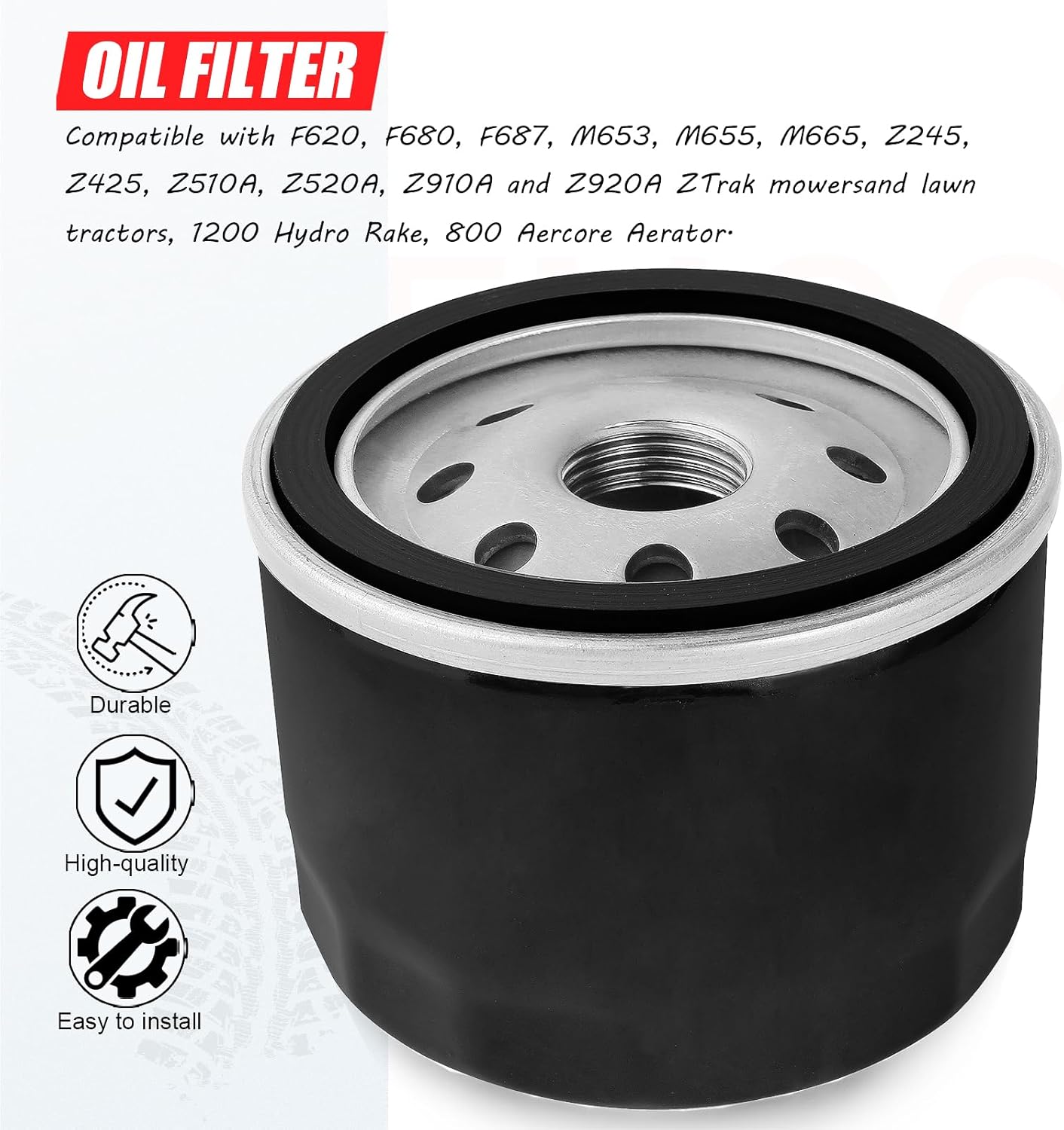 Features: New high-quality oil filter. Diameter: 77mm / 3inch. Height: 57mm / 2.25inch. Seal inner diameter: 63mm / 2.48inch. Seal outer diameter: 72mm / 2.85inch. Mounting thread inner diameter: 19mm / 0.75inch. Mounting thread outer diameter: 21mm / 0.83inch. Relief pressure: 8-11 PSI. Package included: 2 x oil filters. 1 x fuel filter. Compatible with: F620, F680, F687, M653, M655, M665, Z245, Z425, Z510A, Z520A, Z910A and Z920A ZTrak mowersand lawn tractors, 1200 Hydro Rake, 800 Aercore Aerator. Kawasaki: FB460V, FC420V, FC540V, FD501D, FD590V, FR651V, FR691V, FR730V, FX481V, FX541V, FX600V, FX651V, FX691V and FX730V. Vanguard engine small version filter; for 12thru 25 HP engine; pressure lubrication engine. Tecumseh: OHV130, OHV135, OHV150, OHV155, OHV165, OHV175, OHV180, TVT691, OV and VTX. Kohler: CH18-CH25 and CV18-CV25; for 18 thru 25 HP engine. Gravely: XL Series. EZGO: ST480. Replace part number: 4049 4049H 4154 492056 492932 492932B 492932S 5049 5049H 5049K 5076 695396 696854 795890 842921 AM39687 AM119567 AM125424 LG492932S LG 4153 & GY20577 Kawasaki 49065-2057 49065-2076 49065-2077 49065-7002 49065-7007 Bad Boy 063-2004-00 063-4025-00 063-8018-00 Bobcat 2722463 416-4153 416-4537 531307389 531307043 Landpride 831-053C 831053C Kohler 25-050-01 28-050-01S Ariens 21548100 21550800 Craftsman 24603 33935 Grasshopper 100803 Partner PR3033001 Tecumseh 36563 EZGO 492932S Toro 1077817
