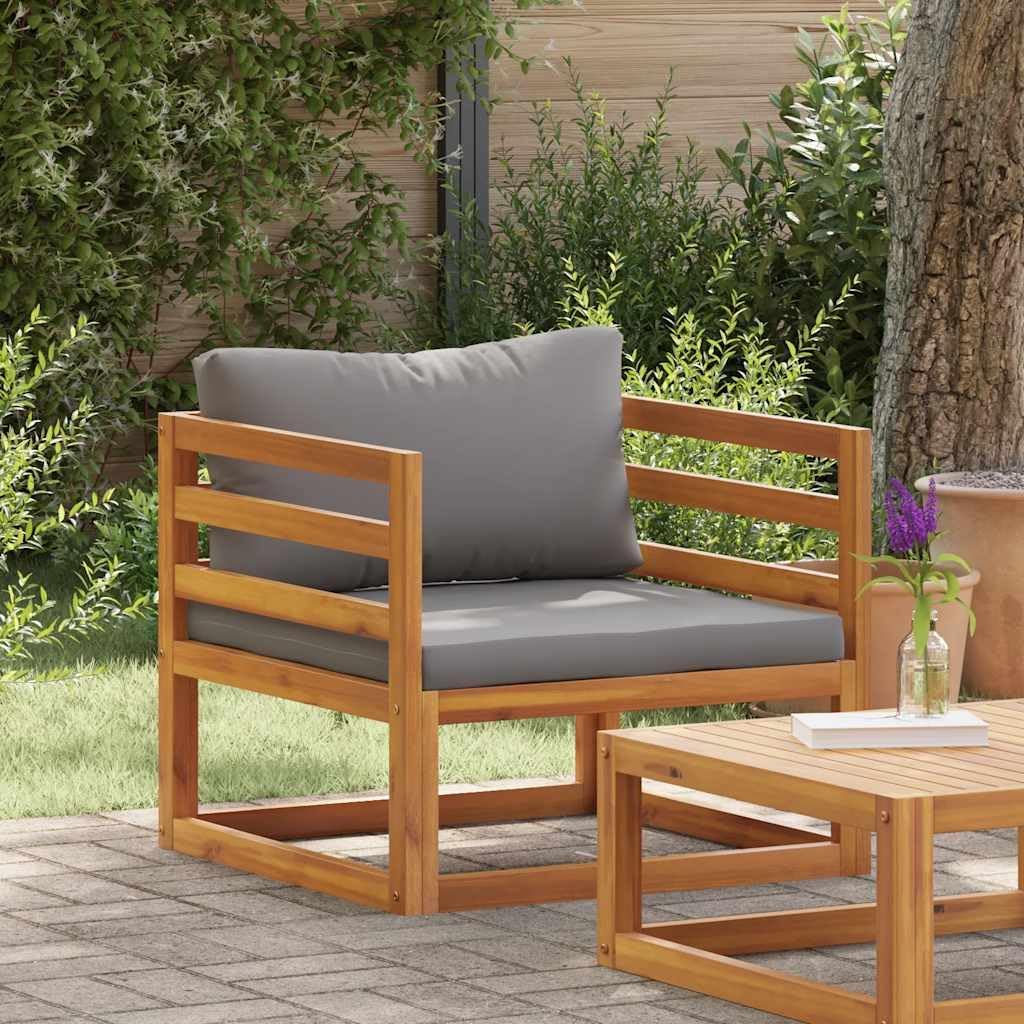 This solid Acacia wood armchair is a stunning addition to any outdoor area, designed to offer both style and comfort. With its mix of natural wood shades and plush dark grey cushions, it boosts the look of your patio, balcony, or garden, enticing you to unwind and soak in the outdoors, whether reading or chatting with friends.Strong Frame: Built from solid Acacia wood, this armchair is sturdy enough to hold up to 264.6 lbs. The oiled finish shields it from moisture, making it long-lasting and resilient against the weather.Comfy Cushions: The two cushions provide top-notch comfort. They’re made with weather- material, so not only do they look great, but they handle outdoor life well, thanks to their zippered design for easy cleaning or swapping out.Minimalist Design: The chair’s simple, square shape fits in nicely with all kinds of outdoor decor, from modern to rustic. It blends in easily with your home while keeping things stylishly simple, making it a great focal point for any gathering.Thoughtful Features: Flat armrests and cushioned seating make for a comfy experience. The chair’s lightweight design allows you to move it around easily, giving you flexibility for different needs.Ready for Relaxation: Whether you're soaking up the sun or enjoying a chill evening under the stars, this chair isfor all occasions. Designed for everyone from newbies to seasoned loungers, it’s reliable for anyone wanting to up their outdoor chill game.Color: Grey Shape: SquareMaterial: Solid Acacia woodFinish: Oiled Indoor/Outdoor: Indoor / OutdoorCover Included: NoRoom: Garden and terraceCapacity: 1 personMaximum Number of People: 1Maximum Weit: 264.6 lbsDimensions: 13.8 x 28.3 x 23.6 in (W x L x H)Surface Height: 0.8 inLeg Height: 11.8 inWeight: 23.81 lbs