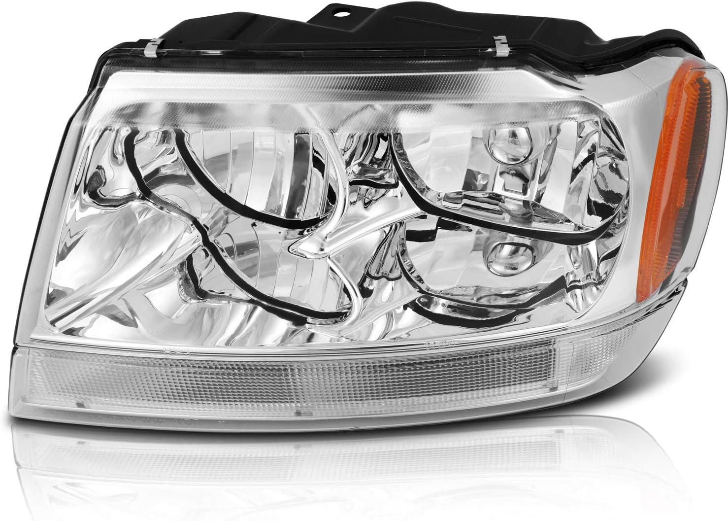 VEHICLE FITMENT:For Jeep Grand Cherokee Laredo Sport Utility 4-Door 1999-2004For Jeep Grand Cherokee Limited Sport Utility 4-Door 1999-2004For Jeep Grand Cherokee Overland Sport Utility 4-Door 2002-2004For Jeep Grand Cherokee SE Sport Utility 4-Door 2004For Jeep Grand Cherokee Special Edition Sport Utility 4-Door 2004For Jeep Grand Cherokee Sport Sport Utility 4-Door 2002PRODUCT INFORMATION:Color appearance:Chrome Housing Amber Reflector Clear LensBulbs type:High Beam :9005XS Low Beam:9006XS signal light:3157 (Bulbs are not included) OE Numbers:55155553AE 55155553AD 55155553AB 55155552AEPackage Included: 1 Pair of Headlight Assembly (1 x Driver Side and 147 x Passenger Side)No Installation Guide or Instruction,Professional Installation is Highly Recommended!