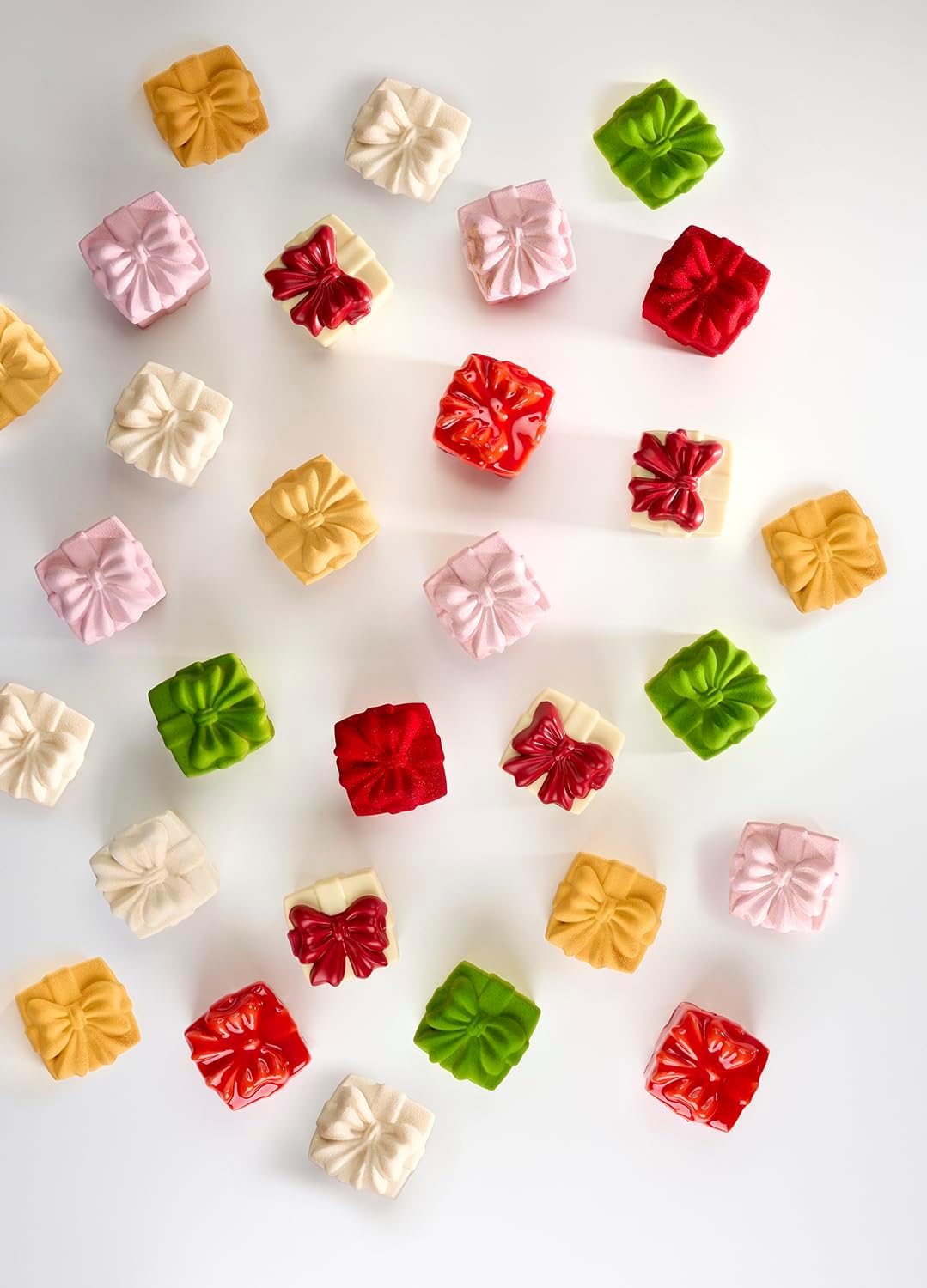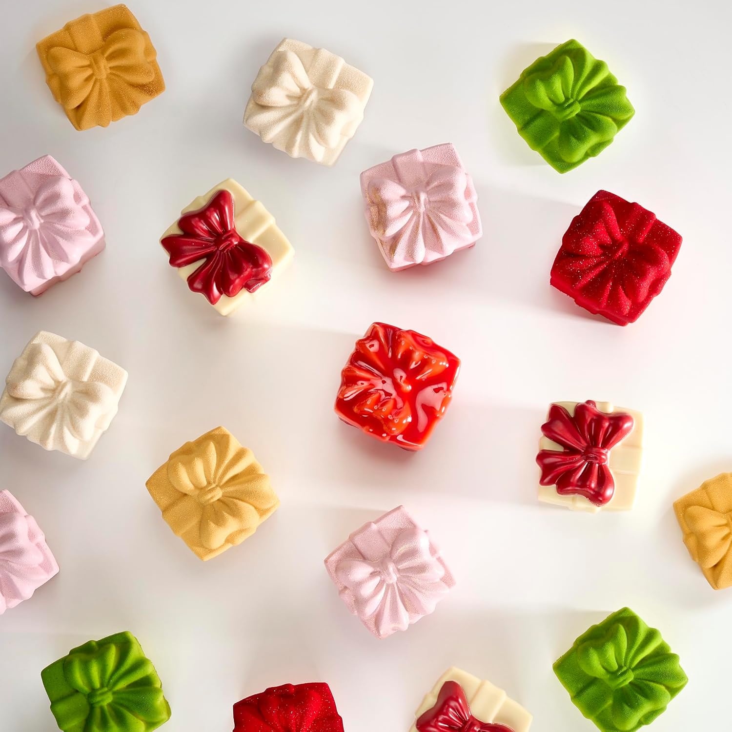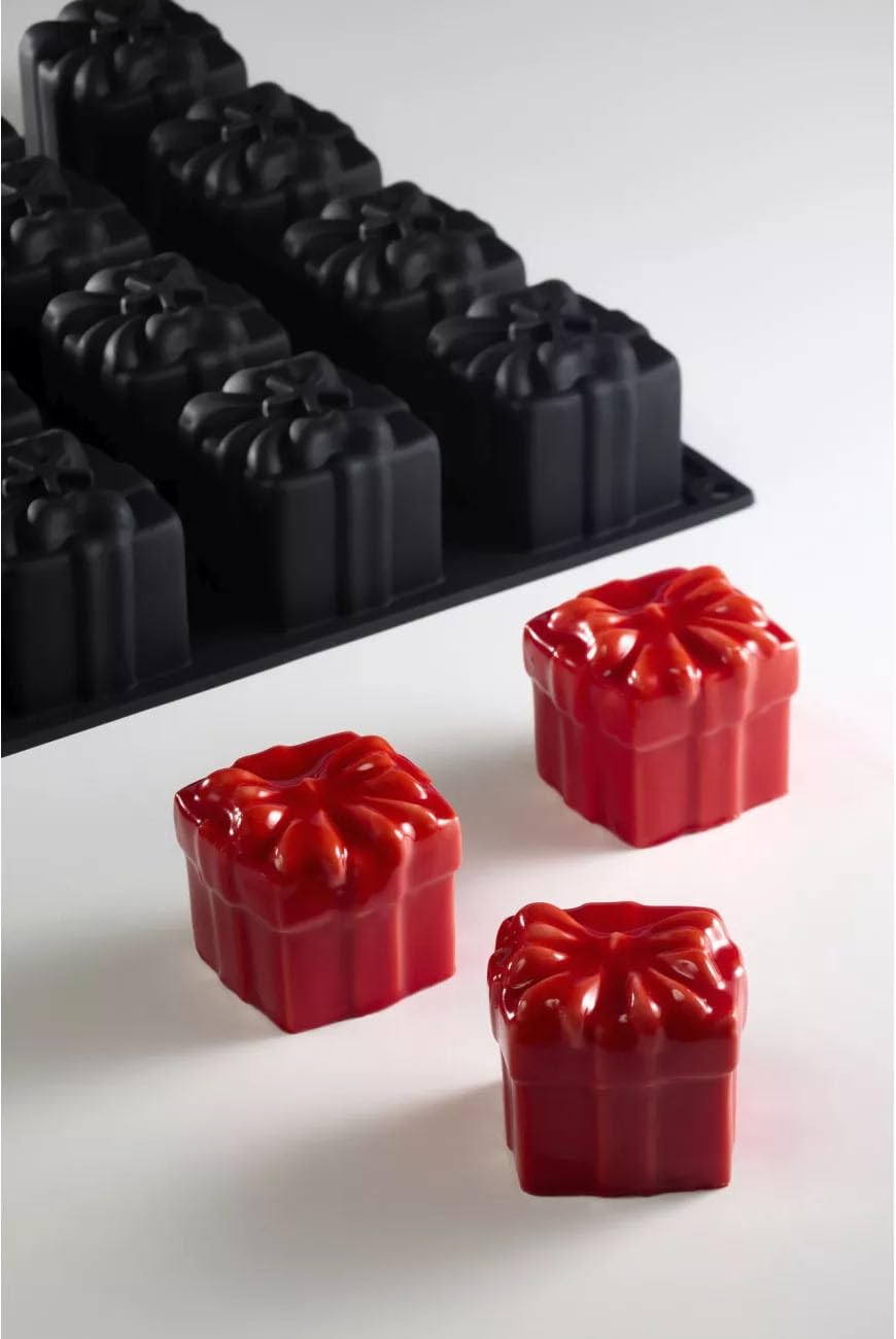 Pavoni PX43951 mold with 20 cubic-gift-box cavities Size each cavity 2.17 inch x 2.17 inch x 2.17 inch (55 millimeters x 55 millimeters x 55 millimeters) Volume each cavity 4.06 ounce (120 milliliters) 100-percent platinum silicone Non-stick and flexible for easy release of food product — turn the mold over for baked products to fall out, or peel mold off frozen product Resistant to heat in oven up to 482 degrees Fahrenheit (250 degrees Celsius) Safe in microwave Resistant to cold in freezer down to -40 degrees Fahrenheit (-40 degrees Celsius) Durable material resistant to stretching and tearing