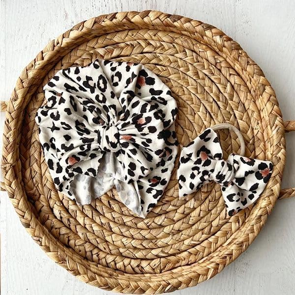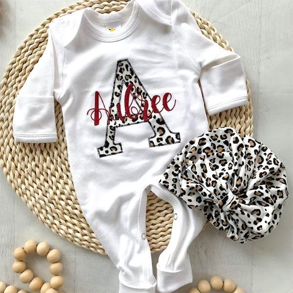 This sweet leopard sleeper is soft and comfortable to snuggle a little one. This features a soft black romper, a large initial in white leopard, with name in s pretty rusty rose through the center. You can also choose a handmade, matching leopard turban, or leopard bow to match. This outfit makes a perfect coming home outfit, newborn pictures, or baby shower gift. Turbans are handmade with a sweet bow on front, and so adorably perfect. Headbands are one size, and fit newborn to adult. They come on a soft nylon headband.