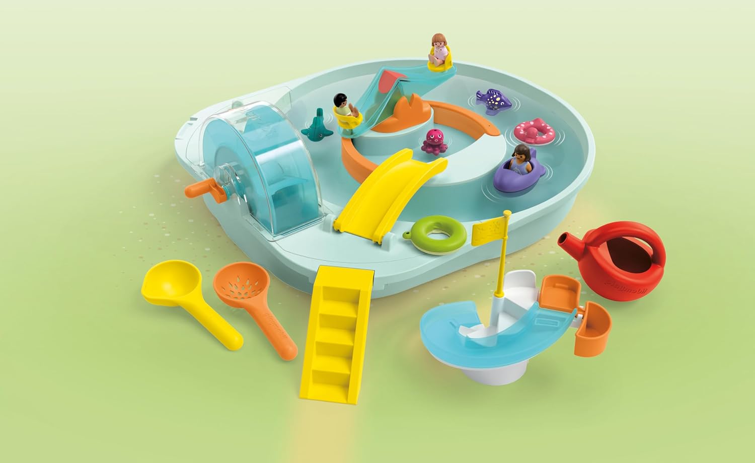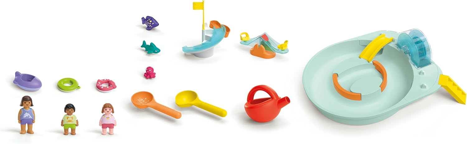 Special product features: • Water tank filled to full capacity (about 8000 ml) • Water flow can be generated in both directions thanks to the water wheel crank • Fish can swim through the rotating channel • Movable bridge and locks • Ladder with two mooring options • Two separate water channels (small and large) can be created using the Locks • Characters equipped with colour-coordinated flotation devices • Slide with tilt function and flag, also playable separately • Swing for two characters, also playable separately • Suitable for outdoor use • Water tank dimensions: approx. 23 x 19.3 x 7.5 cm (L x W x H) • Dimensions of slide with flag: approx. 3 .1 x 2 .5 x 8 cm (L x W x H) • Dimensions of the swing: approx. 8 x 2.5 x 4 cm (L x W x H) Playmobil Junior - designed especially for our youngest Playmobil fans. Perfectly suited for little hands and early discoveries of toddlers. With many attractive features such as stacking, puzzles or sorting, let your 1-4 year old child take their first steps into the vast world of PLAYMOBIL with PLAYMOBIL JUNIOR! PLAYMOBIL JUNIOR guarantees maximum safety for your child: Made in the EU, it is free from plasticisers and swallowable parts. In addition, all items in this range are now made from plastics that contain up to 90% traceable material, which come from food or paper production (rate calculated using the mass balance method used in the circular economy and based on ISCC 208). For our PLAYMOBIL JUNIOR packaging is made at least 90% from cardboard and recycled paper.
