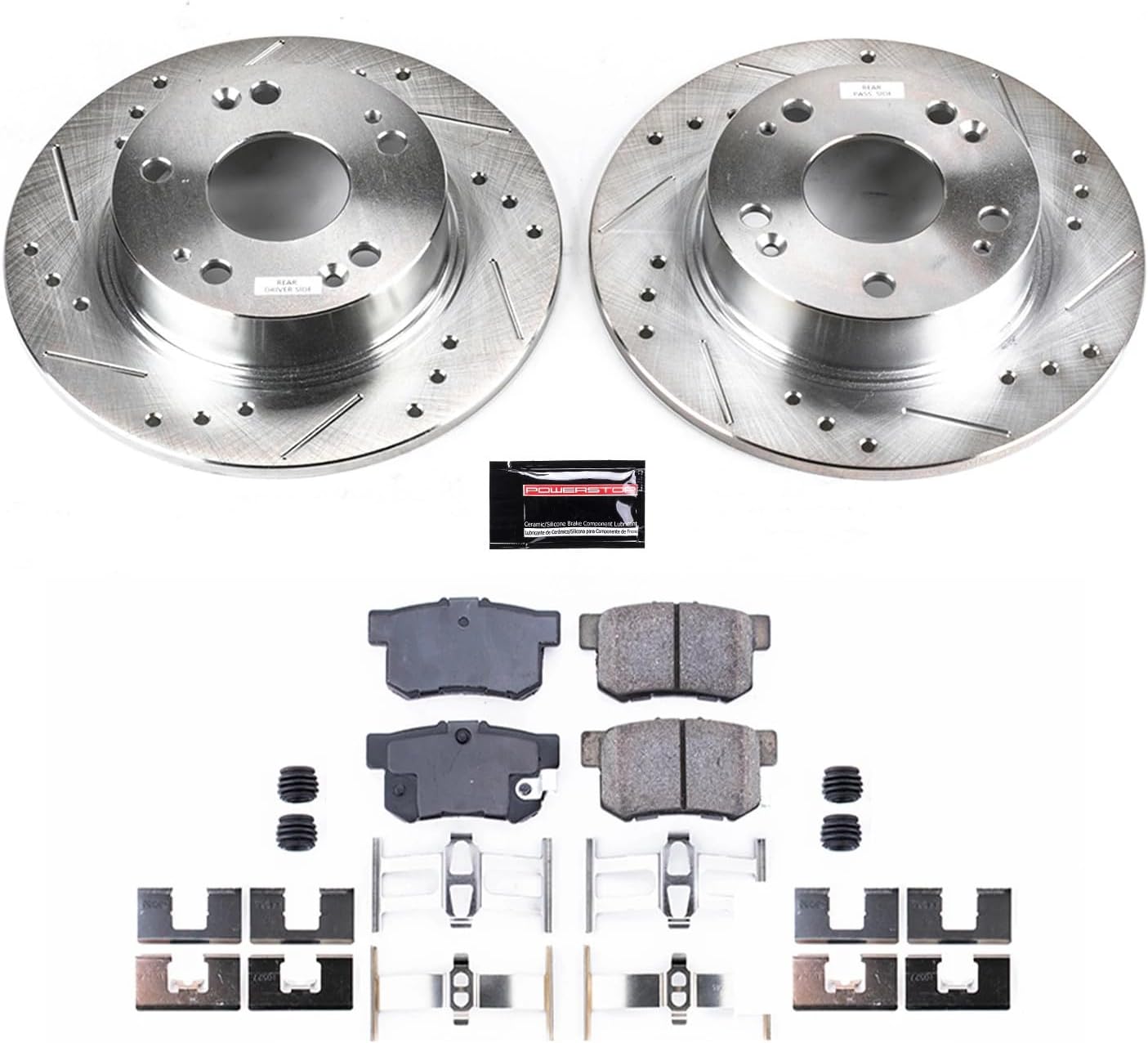 Product: PowerStop Z23 Evolution Sport Brake Pads and Drilled & Slotted Rotor KitWhat’s in the Box: This premium Z23 brake kit upgrade includes Z23 Carbon-Fiber Ceramic Brake Pads, Drilled & Slotted Rotors, Rubberized Shims, and Installation HardwareEngineered For:Long Lasting Performance Seekers - Significant performance improvements above OE brakes with a 3 year / 36,000 mile warranty to back it upThe Enthusiast - Your do it all option to keep you braking quiet and dust free without sacrificing stopping power and temperature control in high demand situationsBolt on ready - This kit includes premium stainless steel hardware for an easy install. No modifications needed to your vehicleComponent Breakdown:The Pads (Z23 Formula) - The included Z23 pads use a low-dust ceramic formula reinforced with carbon fibers. This provides severe-duty stopping power without sacrificing everyday drivability or creating noiseThe Rotors - Zinc plated to protect against rust. The precision drilled holes and rounded slots maximize cooling and wipe away gas/debris—critical for keeping temperatures down during all operating conditionsThe Hardware - High-quality stainless steel installation hardware makes an easy install even easierInstallation: A true bolt-on upgrade. No modifications required. Includes all necessary stainless-steel hardware for a hassle-free installThis Item Fits:Rear: 2004-08 Acura TSX Rear: 2005 Honda Accord GAS; Rear Disc Rear: 2003-04 Honda Accord Rear Disc Rear: 2006-07 Honda Accord Coupe; Rear Disc Rear: 2006-07 Honda Accord GAS; Sedan; Rear Disc