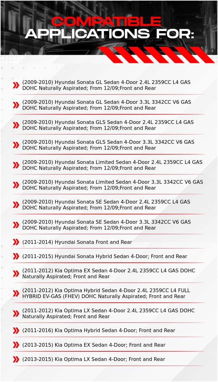 Compatible Applications for:(2009-2010) Hyundai Sonata GL Sedan 4-Door 2.4L 2359CC L4 GAS DOHC Naturally Aspirated; From 12/09;Front and Rear(2009-2010) Hyundai Sonata GL Sedan 4-Door 3.3L 3342CC V6 GAS DOHC Naturally Aspirated; From 12/09;Front and Rear(2009-2010) Hyundai Sonata GLS Sedan 4-Door 2.4L 2359CC L4 GAS DOHC Naturally Aspirated; From 12/09;Front and Rear(2009-2010) Hyundai Sonata GLS Sedan 4-Door 3.3L 3342CC V6 GAS DOHC Naturally Aspirated; From 12/09;Front and Rear(2009-2010) Hyundai Sonata Limited Sedan 4-Door 2.4L 2359CC L4 GAS DOHC Naturally Aspirated; From 12/09;Front and Rear(2009-2010) Hyundai Sonata Limited Sedan 4-Door 3.3L 3342CC V6 GAS DOHC Naturally Aspirated; From 12/09;Front and Rear(2009-2010) Hyundai Sonata SE Sedan 4-Door 2.4L 2359CC L4 GAS DOHC Naturally Aspirated; From 12/09;Front and Rear(2009-2010) Hyundai Sonata SE Sedan 4-Door 3.3L 3342CC V6 GAS DOHC Naturally Aspirated; From 12/09;Front and Rear(2011-2014) Hyundai Sonata Front and Rear(2011-2015) Hyundai Sonata Hybrid Sedan 4-Door; Front and Rear(2011-2012) Kia Optima EX Sedan 4-Door 2.4L 2359CC L4 GAS DOHC Naturally Aspirated; Front and Rear(2011-2012) Kia Optima Hybrid Sedan 4-Door 2.4L 2359CC L4 FULL HYBRID EV-GAS (FHEV) DOHC Naturally Aspirated; Front and Rear(2011-2012) Kia Optima LX Sedan 4-Door 2.4L 2359CC L4 GAS DOHC Naturally Aspirated; Front and Rear(2011-2016) Kia Optima Hybrid Sedan 4-Door; Front and Rear(2013-2015) Kia Optima EX Sedan 4-Door; Front and Rear(2013-2015) Kia Optima LX Sedan 4-Door; Front and Rear