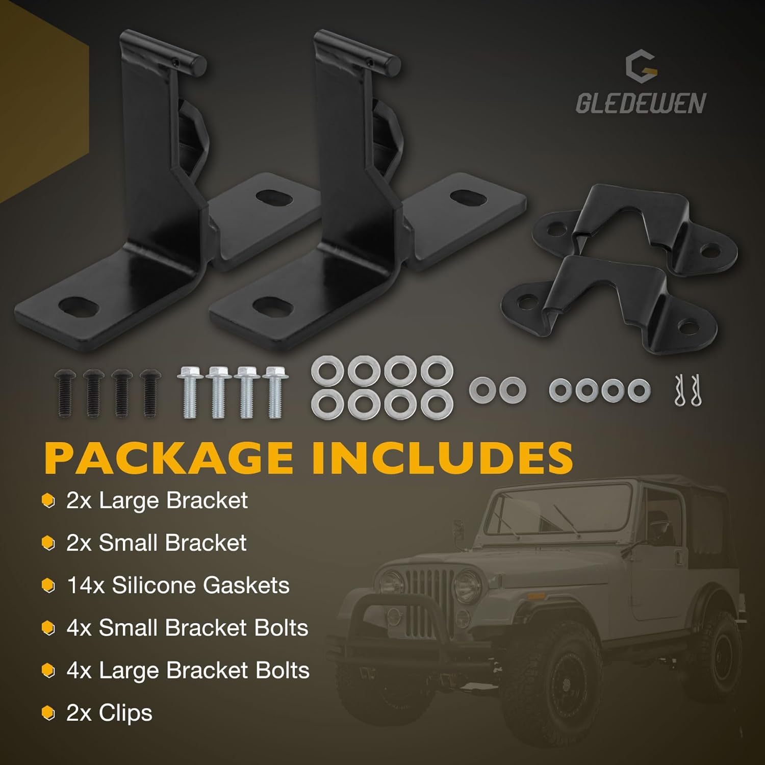 Compatible with:1987-1995 Jeep Wrangler YJ (SUV)1976-1986 Jeep CJ (Pickup)Package List2x Large Bracket2x Small Bracket14x Small Gaskets4x Small Bracket Bolts4x Large Bracket Bolts2x Clips24-Month WarrantyIf you are not sure this item will fit your vehicle, please email us your car photo or provide your vehicle's YEAR, MAKE, MODEL and ENGINE SIZE before you purchase this item.At Gledewen, we take pride in the quality of our products and in your satisfaction. If you have any problems, do not hesitate to contact us.
