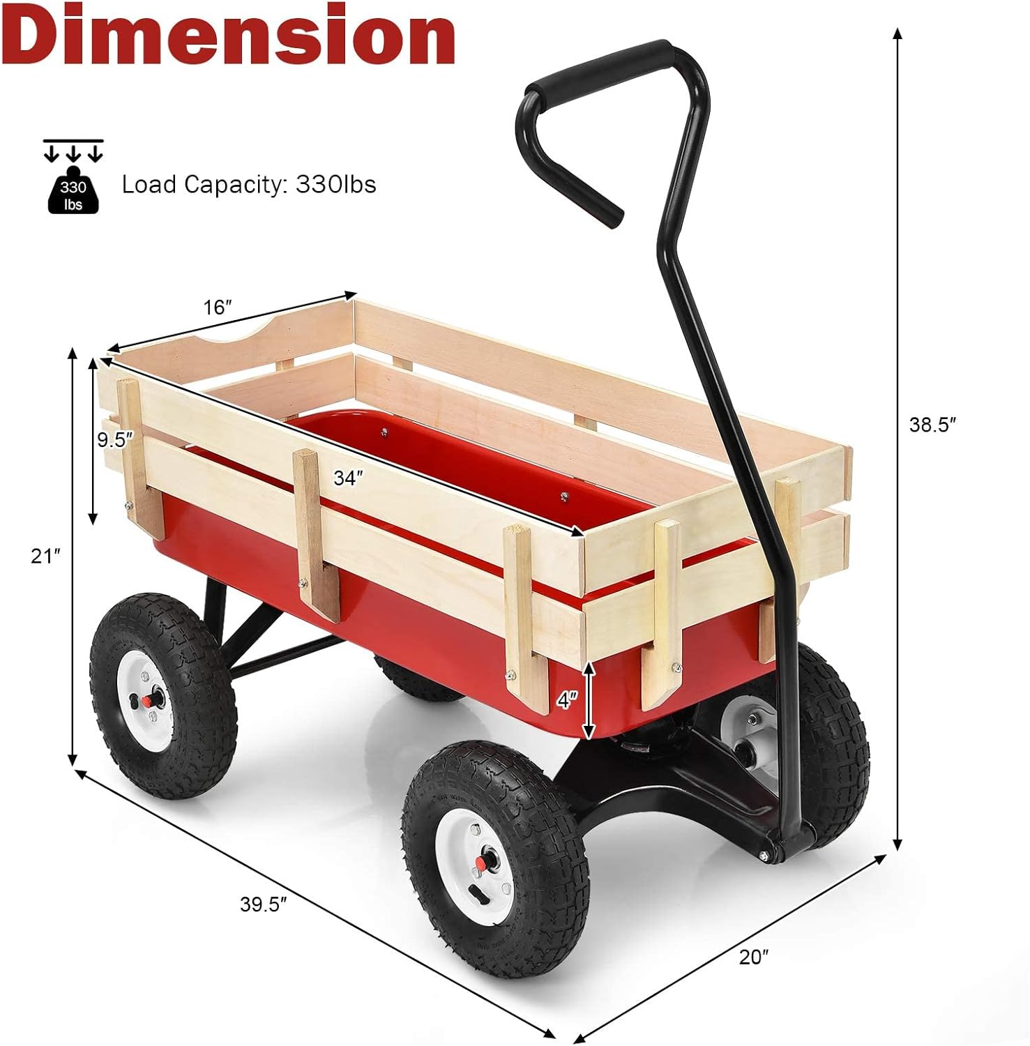 Description:Our large garden cart consists of a steel travel bed and a movable wooden side panel, which is strong and durable and can be used for many years. The maximum load-bearing capacity of the hand trailer is 330 pounds, allowing you to place many things at will. This outdoor station wagon can move heavy objects and garden tools, and has a quick-release dumping function that can be unloaded quickly and easily. Very suitable for your children or older children to play together, and you can also drag gardening tools or supplies in the yard! If you need a station wagon that can handle 330 pounds, don't hesitate to buy it.Features:Made of superior steel and woodDurable and sturdy for years of useSolid connection, won’t fall apart easilySpacious space for you to put various itemsA large weight capacity of 330lbsPadded straight handle for pulling comfortHandle rotate freely for better pulling4 flexible wheels for easy movingEasy assembling with easy-to-understand manualMove heavy supplies and gardening toolsMake unloading quick and fastSpecifications:Color: RedMaterial: Steel + woodOverall Dimensions: 34"(L) x 15.5"(W) x 20.5"(H)Size Of The Wheel: 3.5"(W) x 10"(H)Handle Length: 25"Weight Capacity: 330 lbs Hauling capacity: 600lbsPackage Includes:1 x Garden Cart