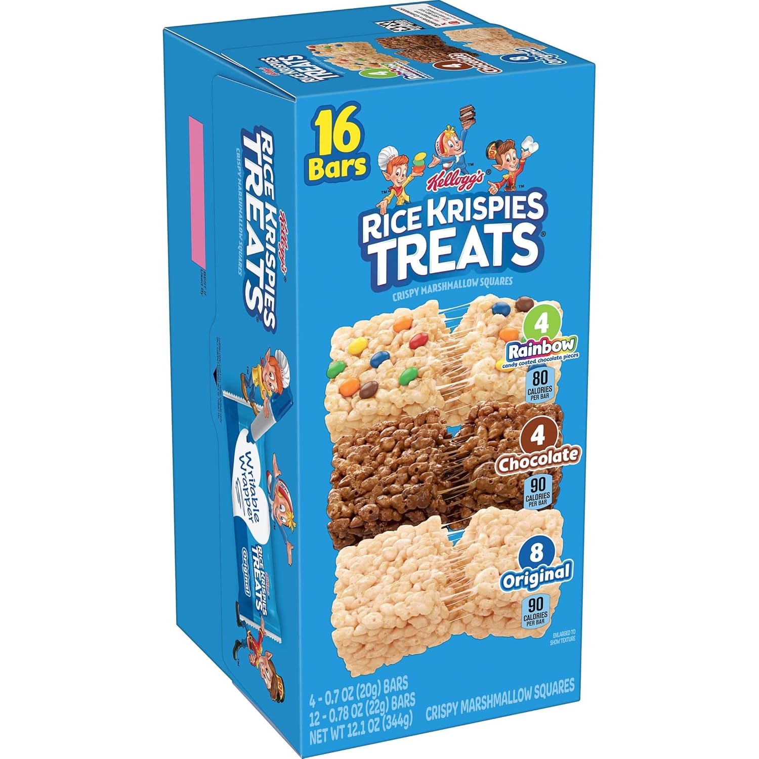 Make snack time a little sweeter and more fun with Snap, Crackle, Pop, and the irresistible taste of Rice Krispies Treats Crispy Marshmallow Squares. Enjoy three sweet and delicious flavors, Original, Rainbow, and Chocolate. When it's time for a sweet snack, take your pick. Each square is made with puffed rice cereal and the taste of chewy, gooey marshmallows for a delicious, ready-to-eat treat wherever you take it. A tasty snack any time of day; each individually wrapped package contains one crispy marshmallow square that's perfect for snacks at school, the office, traveling, lunchtime, at the game, and more. Enjoy them by yourself or share with friends and family, Rice Krispies Treats Crispy Marshmallow Squares make great fillers for goodie bags, gift baskets, or care packages. Satisfy your sweet craving with the simple goodness and on-the-go convenience of Rice Krispies Treats Crispy Marshmallow Squares.