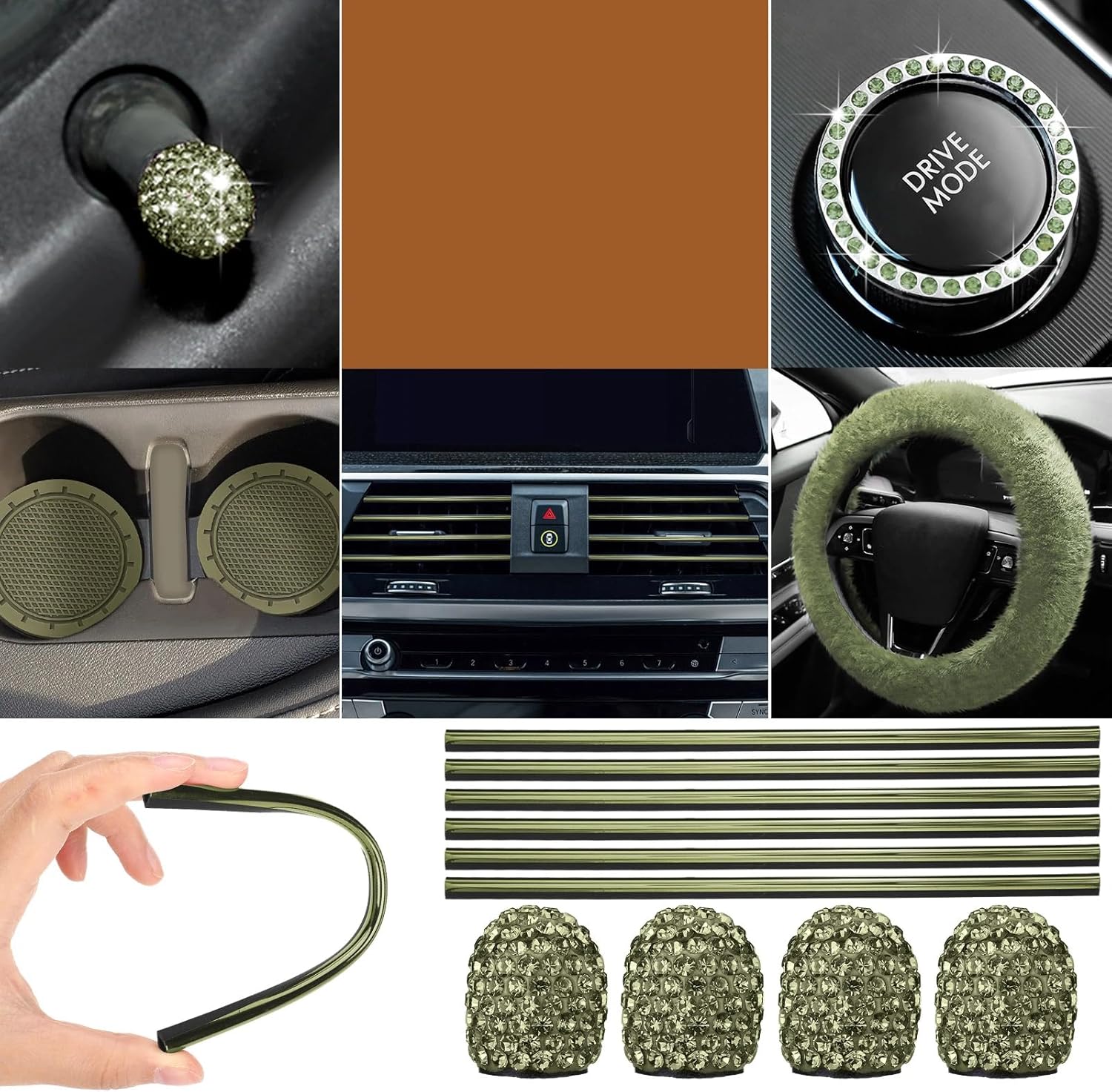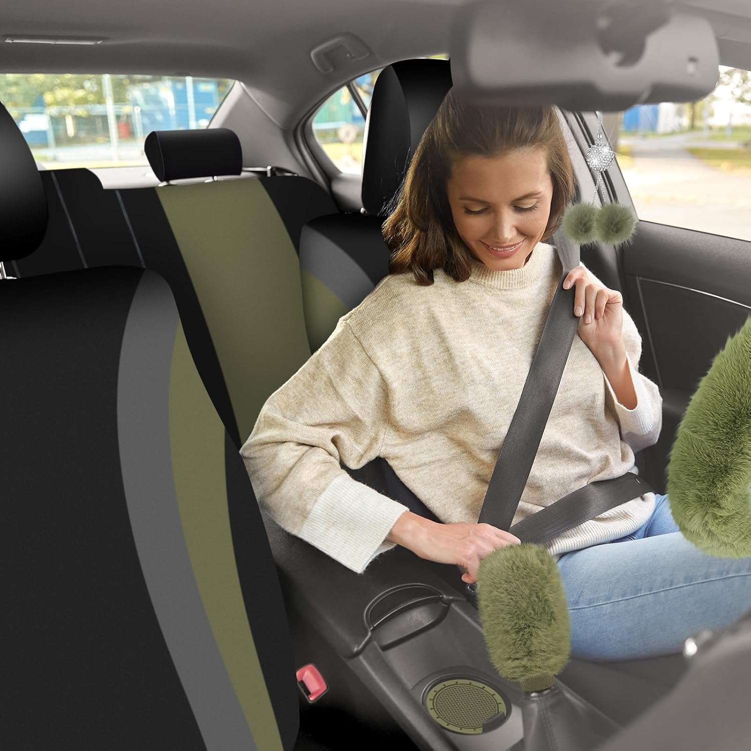 Features: The Car seat cover full set, a comprehensive collection of automotive interior accessories, which is designed to enhance the look and feel of your vehicle. With a vibrant color scheme, this set includes a total of 47 pieces, ensuring that every aspect of your car's interior is covered. Specifications: Color: sage green Size: fits front seats (16.9" W x 21.2" H x 17.7" Dep. ), rear seat (49.2" W x 29.9" H x 16.5" Dep. ), and floor mats (16.9" W x 26.3" L). Please refer to the image for a clearer size reference. Package includes: 2 x Front seat covers 5 x Car headrest covers 2 x Rear bench seat covers 1 x Plush steering wheel cover 1 x Handbrake cover 1 x Gear shift cover 2 x Car cup mats 1 x Rearview mirror hanging accessory 2 x Ring stickers 2 x Seat belt pads 4 x Car floor mats 4 x Valve tire caps 20 x Car vent decorations Notes: Manual measurement, please allow slight errors on size. The color may exist a slight difference due to different screen displays.