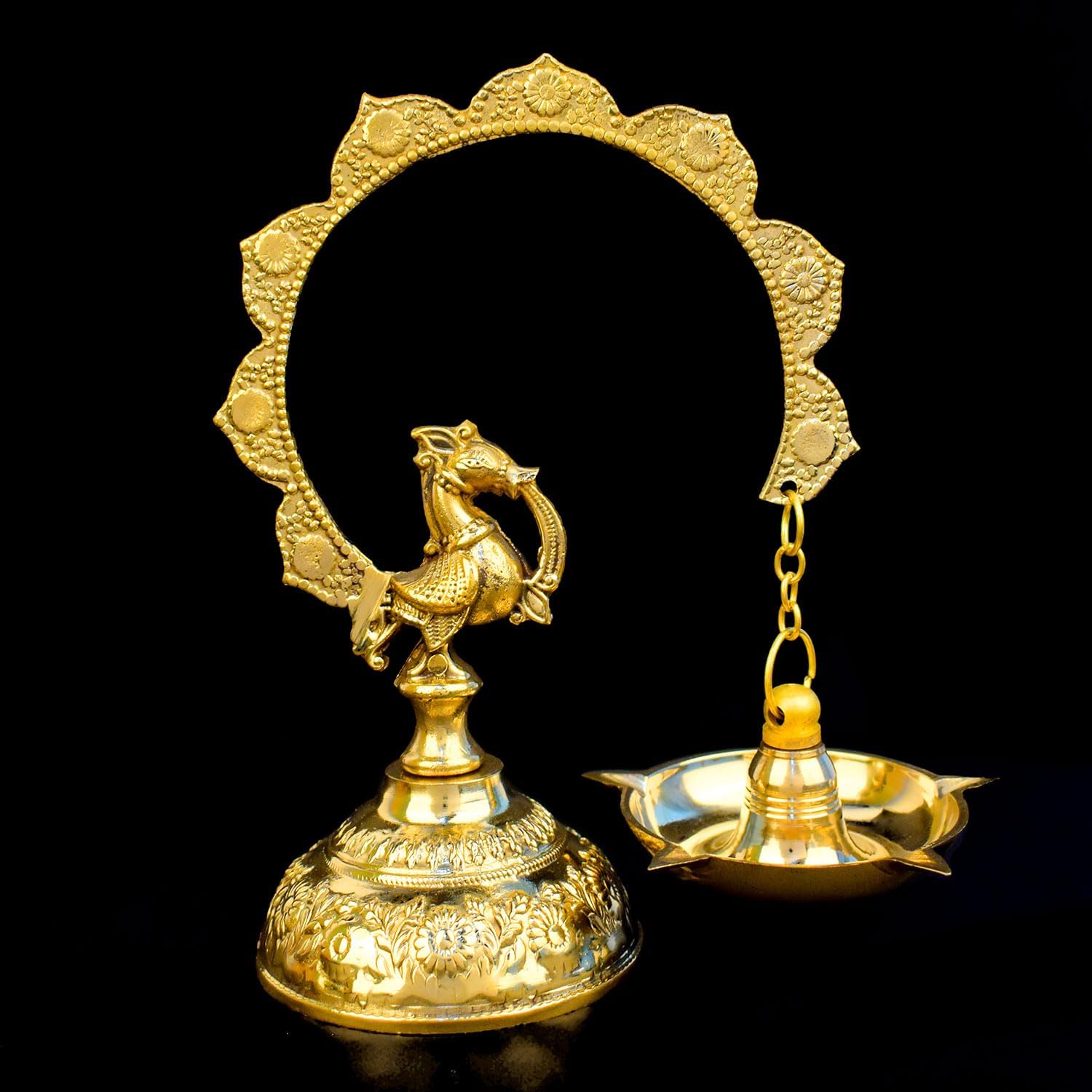 Illuminate your home with the timeless beauty of this Hanging Peacock Brass Diya. Expertly handcrafted from solid brass, this diya showcases a graceful peacock design, symbolizing prosperity and good fortune. Its antique finish and intricate detailing make it a standout piece for any traditional or modern décor. Measuring 19.5 cm in height and 16 cm in length, and weighing approximately 450–500 grams, this diya is perfect for hanging in your puja room, living area, or entrance. The attached chain ensures easy and secure hanging, making it ideal for festive occasions like Diwali, Navratri, and weddings, as well as for daily rituals. Whether used as a spiritual centerpiece or a decorative accent, this brass diya brings warmth, positivity, and a touch of Indian heritage to your space. It also makes a meaningful gift for housewarmings, festivals, and special occasions.