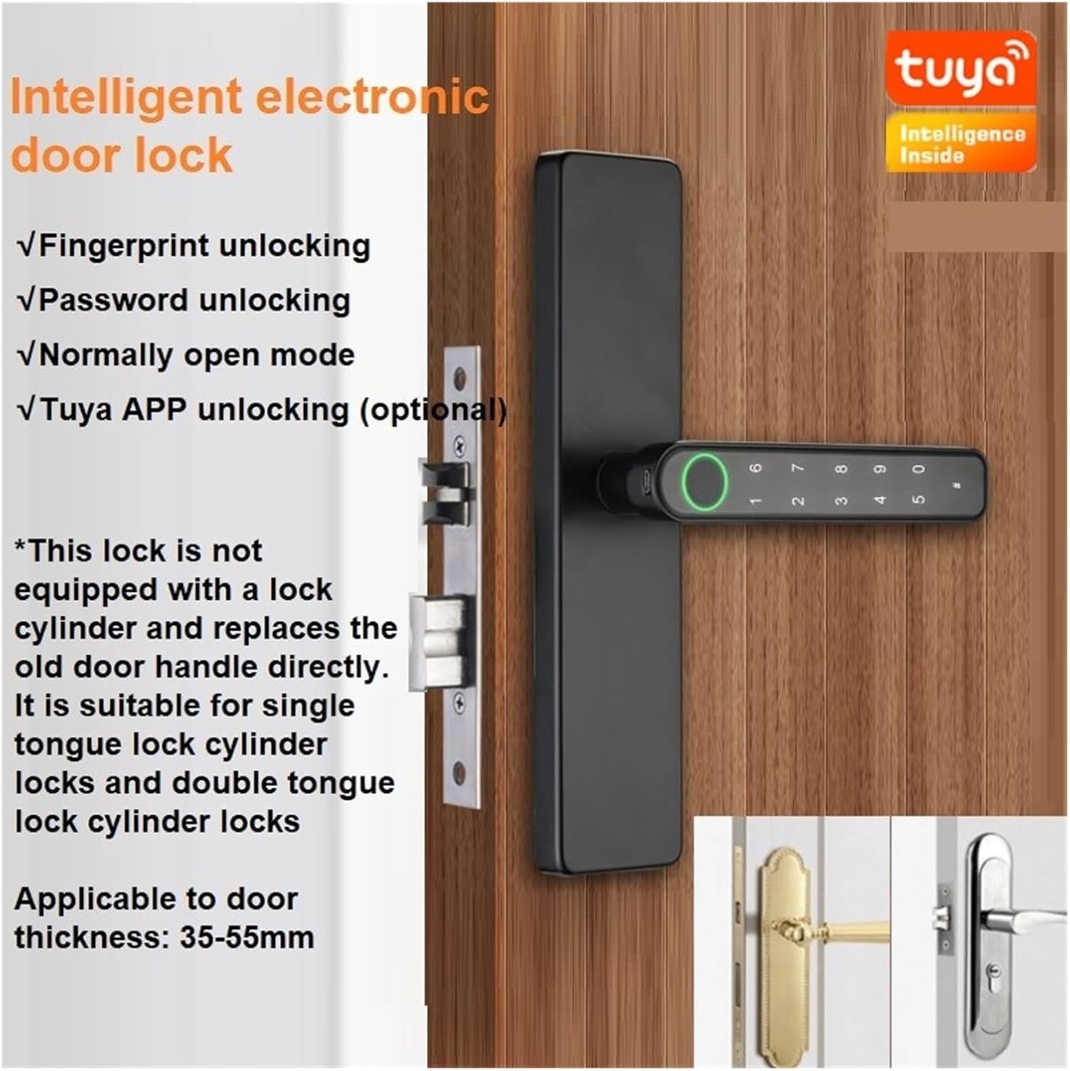 Aention Aention Aention!!!There are two types of locks sold here, with a total of 3 combinations Type1: Standard lock Unlock method: fingerprint, passwordNo app unlocking functionType2: smart lock Unlock method: fingerprint, password, appConnecting to gateway enables remote unlocking of unlimited distancesType3: lock+ gateway Unlock method: fingerprint, password, app, remote unlockNOTE:Suitable for door thickness 35-55mmThis lock is not equipped with a lock cylinder and can be directly replaced with the old lock handleIntelligent electronic door lock function: Fingerprint unlockingPassword unlockingNormally open mode APP (optional)Product Introduction: 1. The installation of this smart lock is very simple. The screw holes on the back plate of the door handle are adjustable, with an adjustment range of approximately 50-200mm.2. Multiple unlocking methods, bidding farewell to mechanical key unlocking mode3. Normally open mode can be set for easy entry and exit4. Equipped with an emergency charging port, you can use the power bank to temporarily charge and unlock the baery when it runs out of charge. After unlocking, please replace the baery promptly5. When the baery level is low, the lock will automatically sound an alarm to remind you to replace the baery6. When connecting to the gateway, the lock can be remotely unlocked7. Applicable door thickness: 30-55mm. If you have other door thicknesses, please contact us promptly for consultation8. Scope of application: Indoor, not recommended for outdoor use as it is not protected from rain or sun protectionProduct parameters: Fingerprint type: semiconductorFingerprint capacity: 50 fingerprints, 100 sets of passwords (the top three are administrators)Color category: Silver/Cool BlackProduct material: zinc alloyPower supply: 4 * AAA baery (alkal