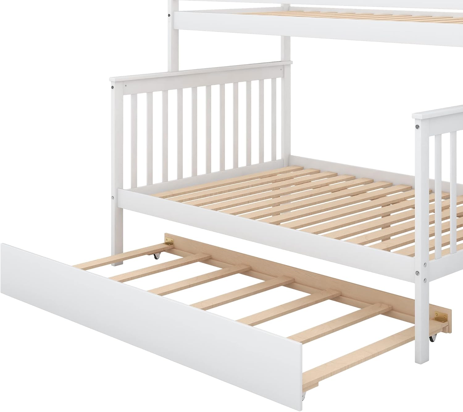 Are you looking for the perfect bed for your growing child? Introduce this bunk bed. This stylish bed will provide comfort and space. It's perfect for siblings who share a room or for sleepovers! It crafted from pinewood and MDF reinforcements. This bunk bed for added storage or can be separated into one twin and one full-size bed and a trundle bed. The side of the bed can be stored. The design of the stairs is also safer. Description Material: Pine wood+MDF Size: Twin over full Colour: White/ Gray numbers of slat: 10 Function: With trundle Decoration: With staircase numbers of package: 3 Spring box: No need Assembly Required: Yes Origin: Vietnam Dimensions: Upper bed: 42.8’’ x 76.3’’; Down bed: 57.8’’ x 76.3’’ Total height: 65.3’’ Bunk Bed Weight capability: 200lb Upper bed Mattress thickness: 6’’ Down bed Mattress thickness: 8-10’’