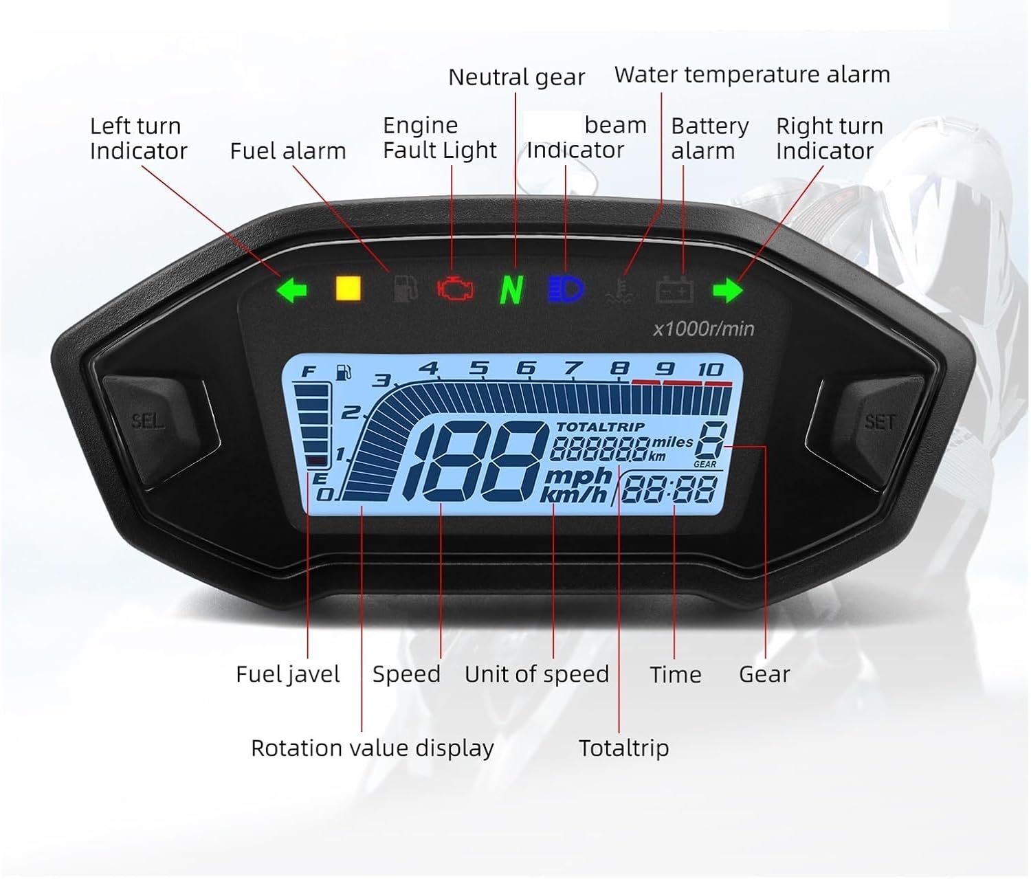 Hello dear friend:Welcome to our motorbike parts shop!We have a wide range of accessories, there is always one for you!Universal For 2,4 Cylinder 10000RPM Motorcycle Display Speedometer Odometer Tachometer With Digital Sensor Dashboard GaugeFitment:Universal fits most motorcycle modelsFor 2,4-cylinder motorcyclesSpecifications:Product Name: Motorcycle OdometerBlack: positive yellowRed: battery positive blue/redBlue: High beam, 12V is controlled Green/BlackBlue and white: fuel signal lineBlack and white: sensor signalOperating voltage: 10V-15VSpeed calibration: 42.5Hz corresponds to 60KM/HGreen: negative sensorSpeed calibration: 166Hz corresponds to 13*1000r/minscreen: 7 colors backlight short press to switchVoltage: Less than 11.3V undervoltage symbol flashes, higher than 11.7V undervoltage symbol is not displayedFuel calibration: E point 98, F point 8Orange: Left turn, 12V positive control yellow/whiteLight blue: Turn right, 12V is controlled Green/RedDue to time difference, we may not be able to reply your message on time, but you can order the item normally.