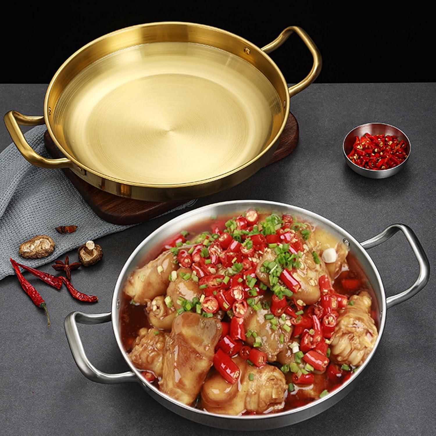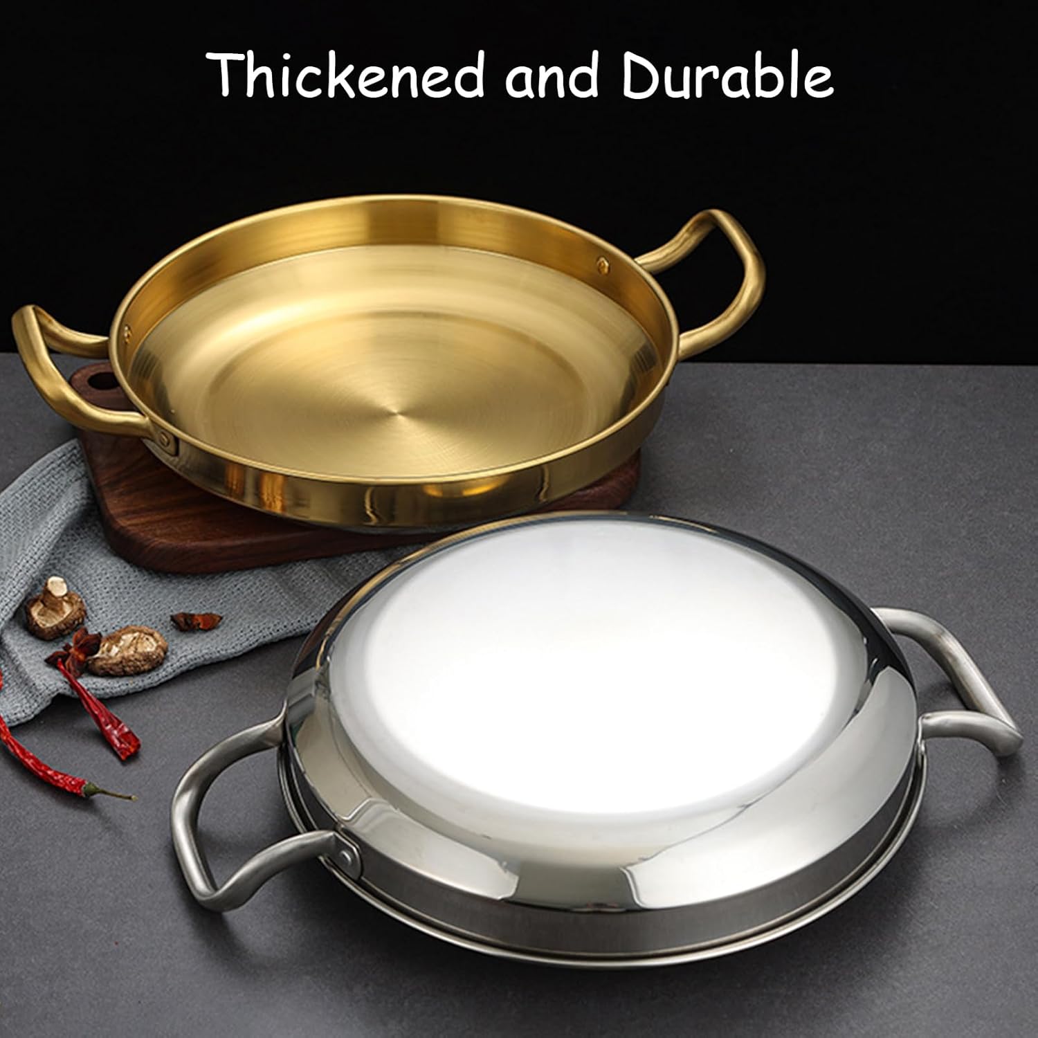 Spanish seafood lobster plate western food commercial plate french double ear oval steak plate stainless steel food plate.Features:- The Korean grill pan has wide, proper curved shape and nonstick, scratch-resistant coating, it is easy to flip the food.- Non-stick round baking pan can be heated up quickly, making food fast and delicious soon.- Anti-scalding handle, hangable design, convenient for travel, easy to carry.- Our grill pan can be used on induction or electric cooktop, gas stove top and hot plate.Specification:Item Type: Round BBQ Grill PanMaterial: 316 Stainless steelColor: Gold, SilverPot Size: 26cm/10.2inch, 28cm/11inch, 30cm/11.8inchFeature: Non Stick, Uncoated, Dishwasher-SafeApplicable Objects: Outdoor, Campers, Kitchen UsersOccasion: Camping, Barbecue, Commercial CookingPackage List:1 x BBQ Grill Pan