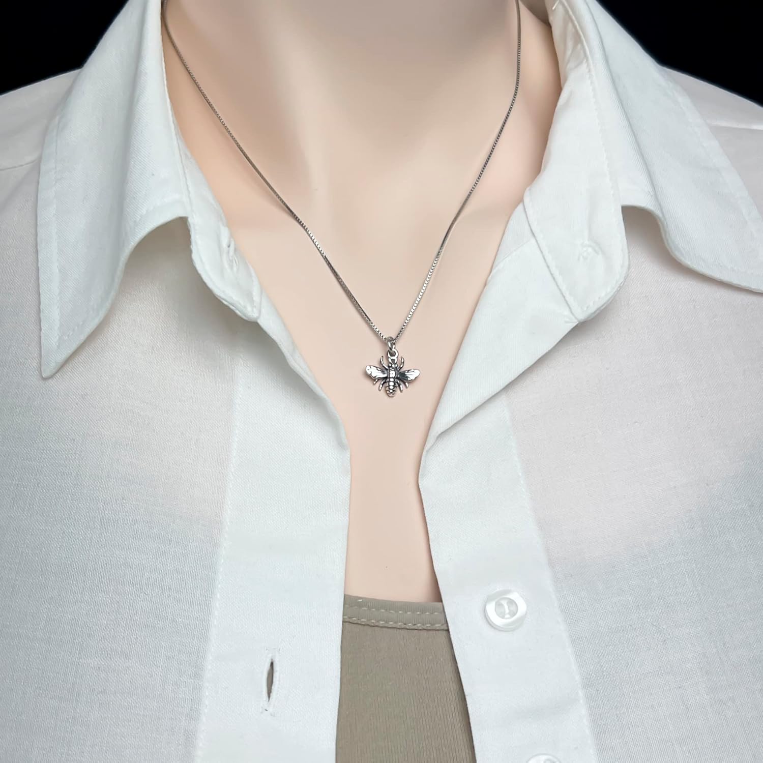 | Material | sterling silver bee pendant, rhodium plated sterling silver box necklace chain |