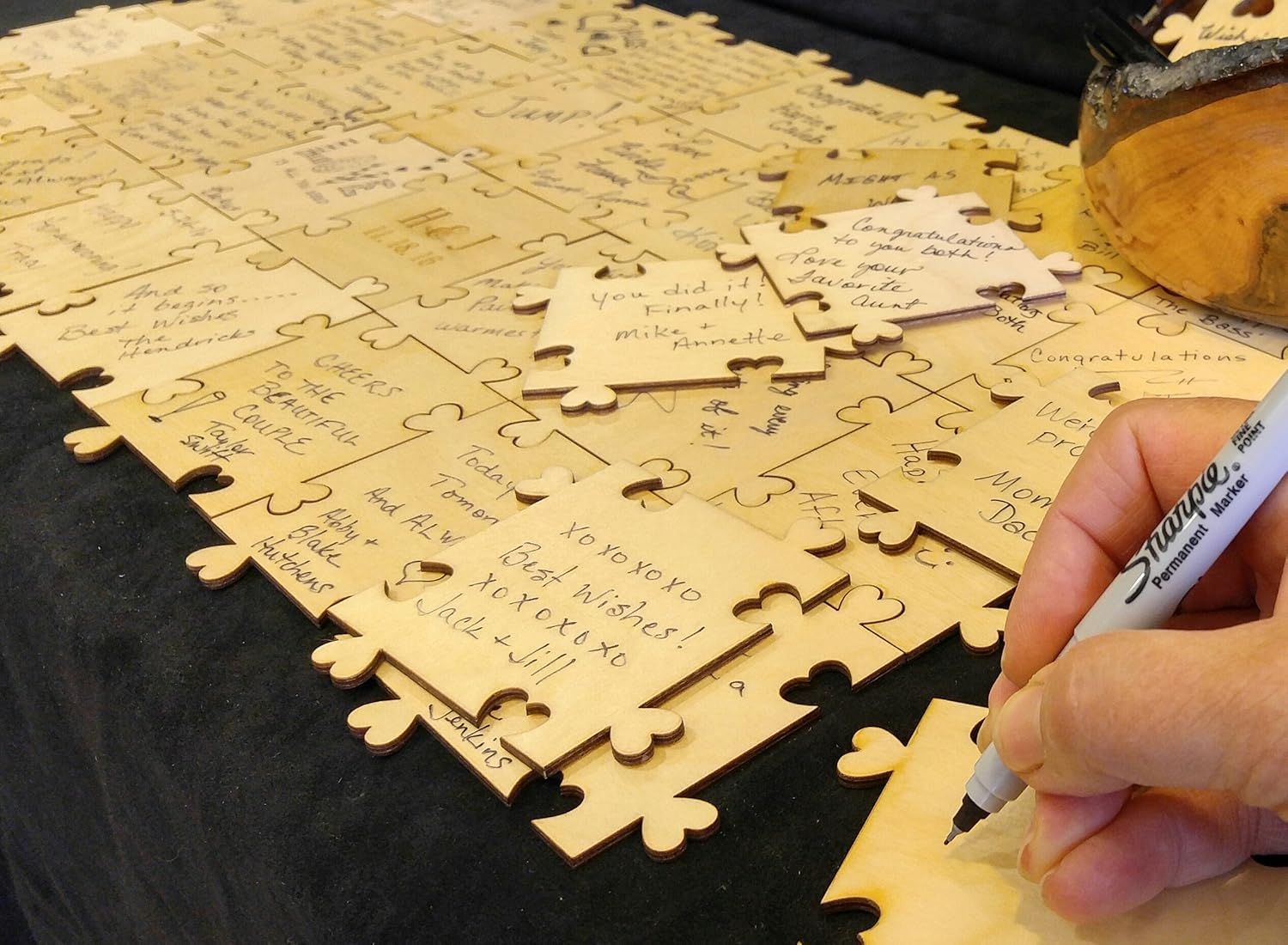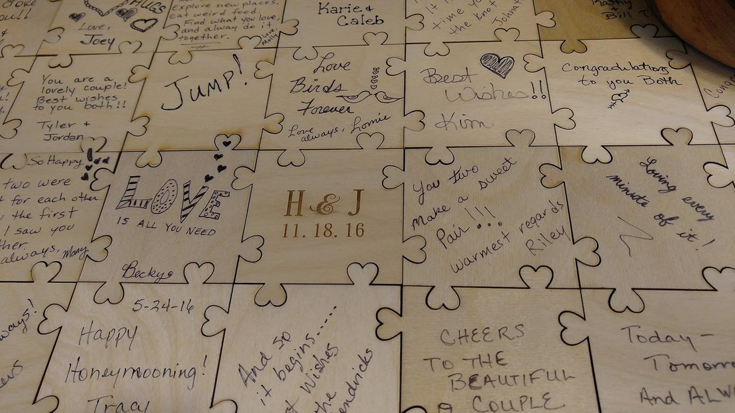 This is a fun guest book. 3 inch by 3 inch wood puzzle pieces. Each piece is EXACTLY the same. Easy breezy to put together and no worries if a piece gets lost. EASY, EASY, EASY to replace. Use as many as you like and DIY frame after the celebration Pieces are huge...a good huge! Perfect for a wedding, baby shower or retirement party. Plenty of room for names and a note. Permanent markers work great on this UV coated 1/8th inch thick birch. One piece CUSTOM engraving is INCLUDED!!!!. Please leave us a note at check out. Will arrive in a nice white carry box.