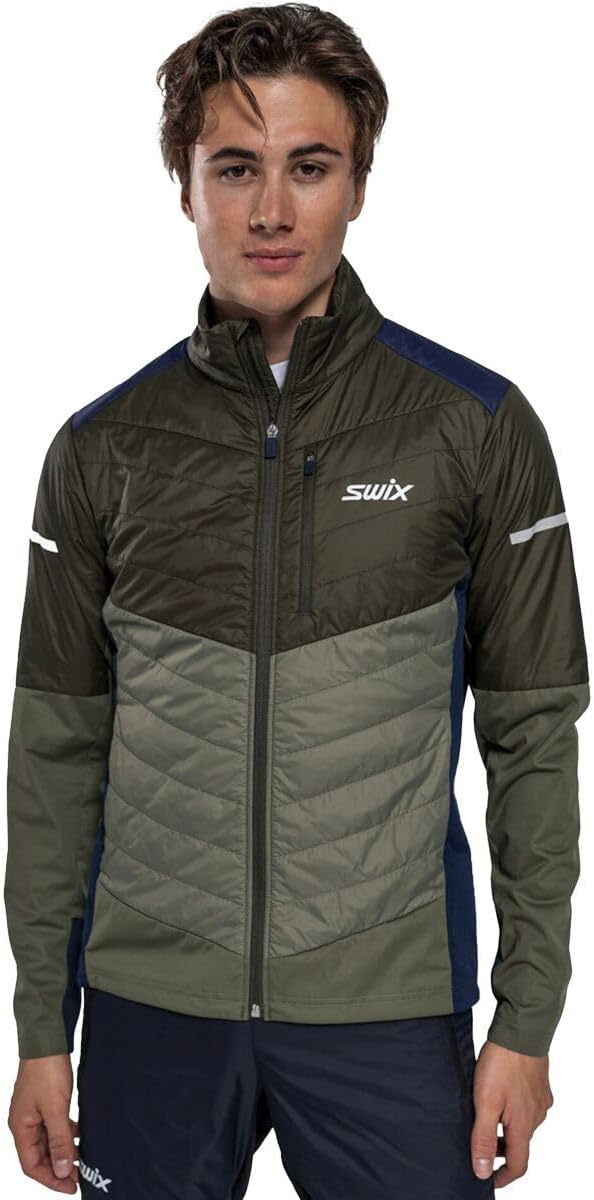 SWIX MEN'S DYNAMIC HYBRID INSULATED JACKET: Dynamic Hybrid Insulated Jacket M is made for cross-country skiing in colder weather and high intensity. Body-mapped construction, in order to keep you warm and dry. Hybrid garment, with Primaloft, thermally insulating at the front, shoulders, top sleeves, and collar. 3-layer material on the front bottom body, sleeves, and side panels for wind protection. Lighter panels at the back for breathability. Reflective details at the center back and sleeves. Stretch cuffs at bottom hem sleeves. Adjustable drawstring at bottom hem body. 3 zippered pockets; 1 at the outer chest and 2 hand pockets. MAIN FEATURES: - Body-mapped construction to keep you warm and dry; - Primaloft Silver Insulation Active 40g at front, shoulders, top sleeves and collar for extra warmth on colder and windy days; - 3-layer material on front bottom body, sleeves and side panels for wind protection; - Lighter panels at back for breathability; - Partly lined for comfort; - 3 zippered pockets; 1 at outer chest and 2 hand pockets; - Reflective details on center back and upper sleeves. MADE FOR: - Cross Country Skiing; - Active Lifestyle.