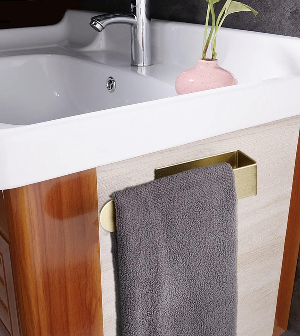 Towel rack by High quality SUS304 stainless steel, rust free and durable, sturdy and well made Suitable for humid environments such as bathroom and kitchen. Feature: Material : SUS 304 stainless steel Finish:Stainless steel brushed colour:Golden Dimensions : rod length 8.7 in / 22 cm, distance from the wall 1.97 in /5 cm. Packaging: hand towel holder x 2 Installation Method : Self Adhesive or Wall Mount How to install:Self Adhesive 1. The wall should be kept dry and clean(must be smooth surface, like ceramic tile, metal surface ,glass etc,not suitable for wall paper or painted wall ) 2. Then peel off the back protective film of the self-adhesive pad and stick it on the smooth wall surface, then press the hand towel rack for several seconds. 3.It is recommended to wait 24 hours before hanging thing to ensure the product is firmly fixed.