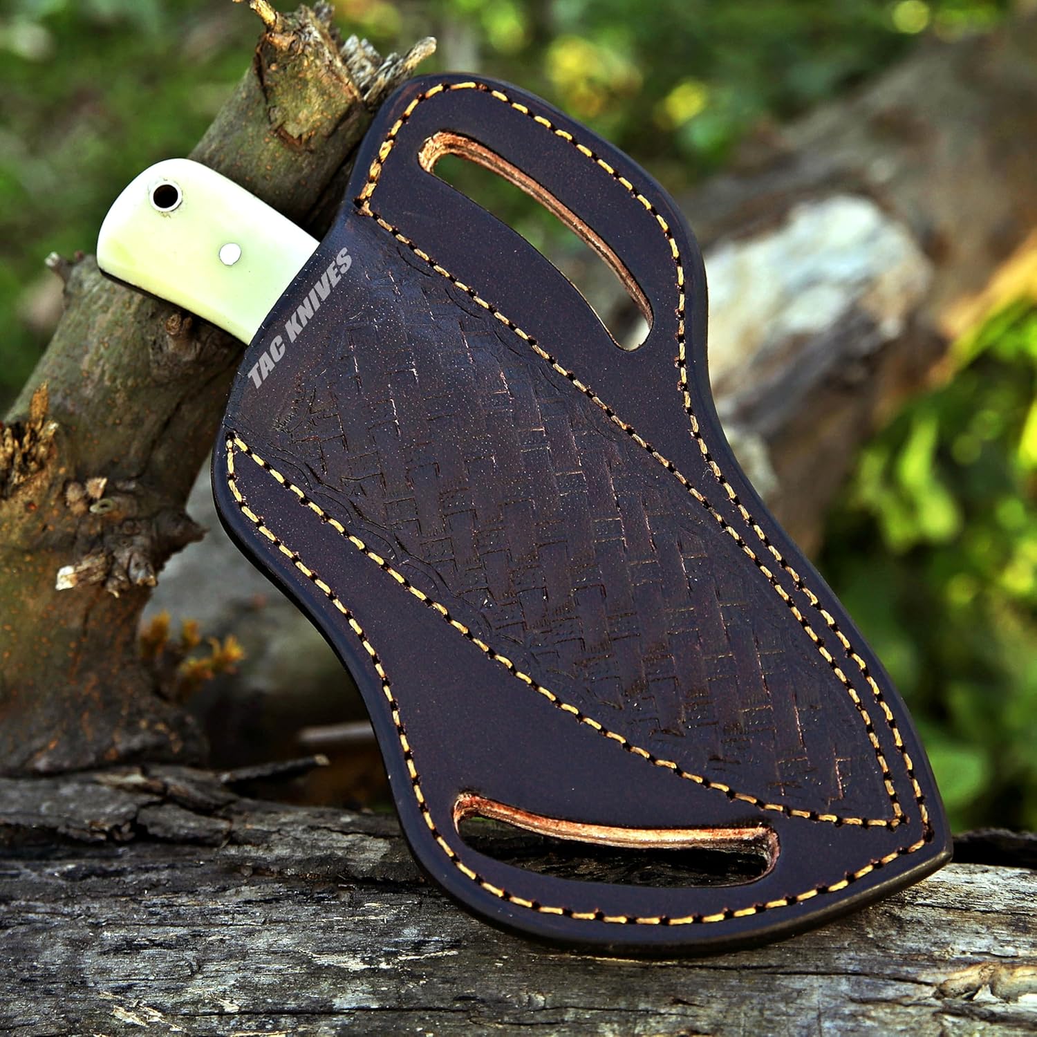 Handmade Damascus Steel Skinner Knife Overall Length: 7" Handle Length: 4" Blade Length: 3" Blade. Material: Damascus Steel Blade thickness: 4 mm Hardness: 56-58 Tang: Full Tang . Handle Material: BONE , Wood. Includes a hand stitched custom full-grain leather sheath with a belt loop. Tips to Care Knife: Never store your knife for long time in leather sheath. Leather can absorb water, which can rust the knife. Always clean the blade after using with oil or wax.