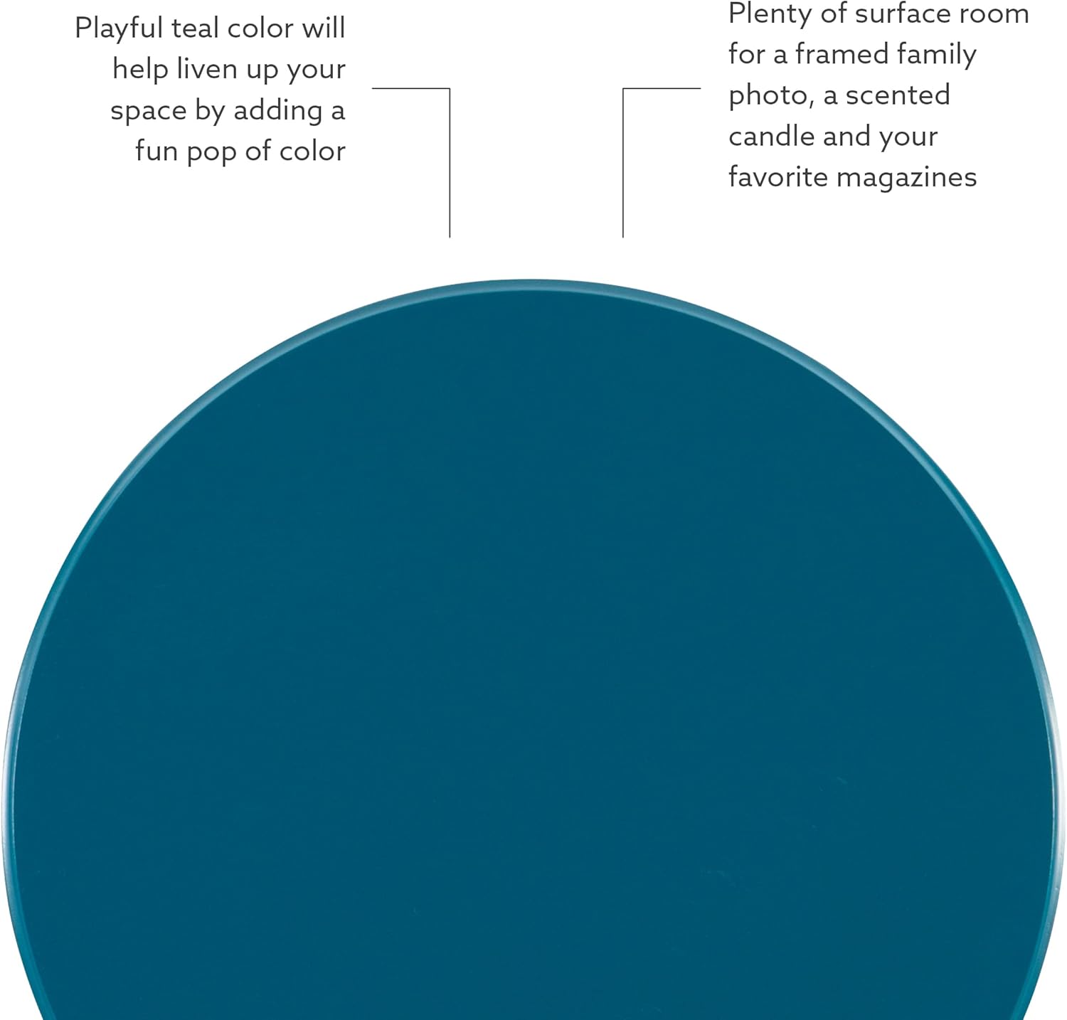 A gorgeous accent table in a playful teal color that will help liven up your space by adding a fun pop of color. Made from solid wood, it features a sturdy pedestal base with a turned spindle that is complemented by the clean lines of the round tabletop. This accent table looks just right next to your favorite living room armchair, or even serving as a cute table in the entryway. There's plenty of room on its 17 inch diameter surface for a framed family photo, a scented candle and your favorite magazines.