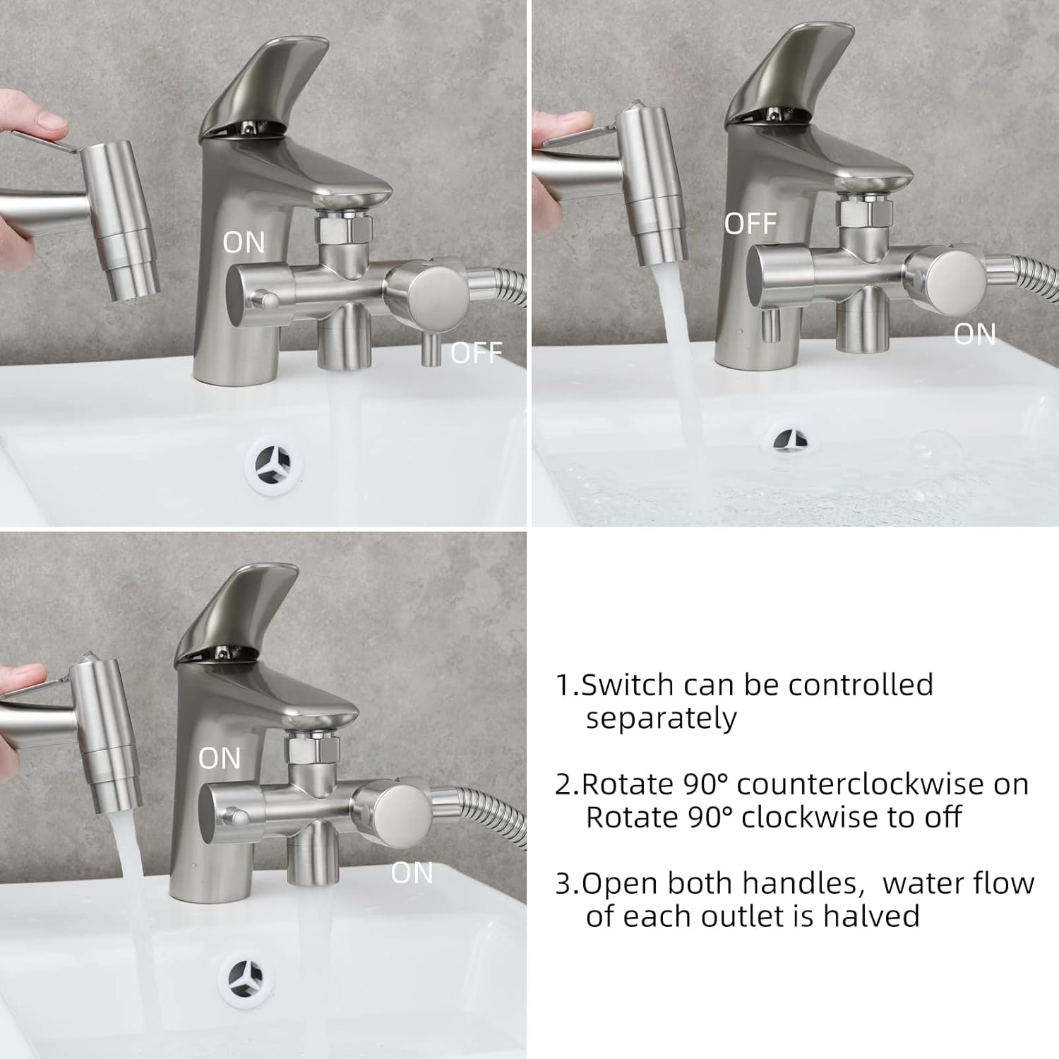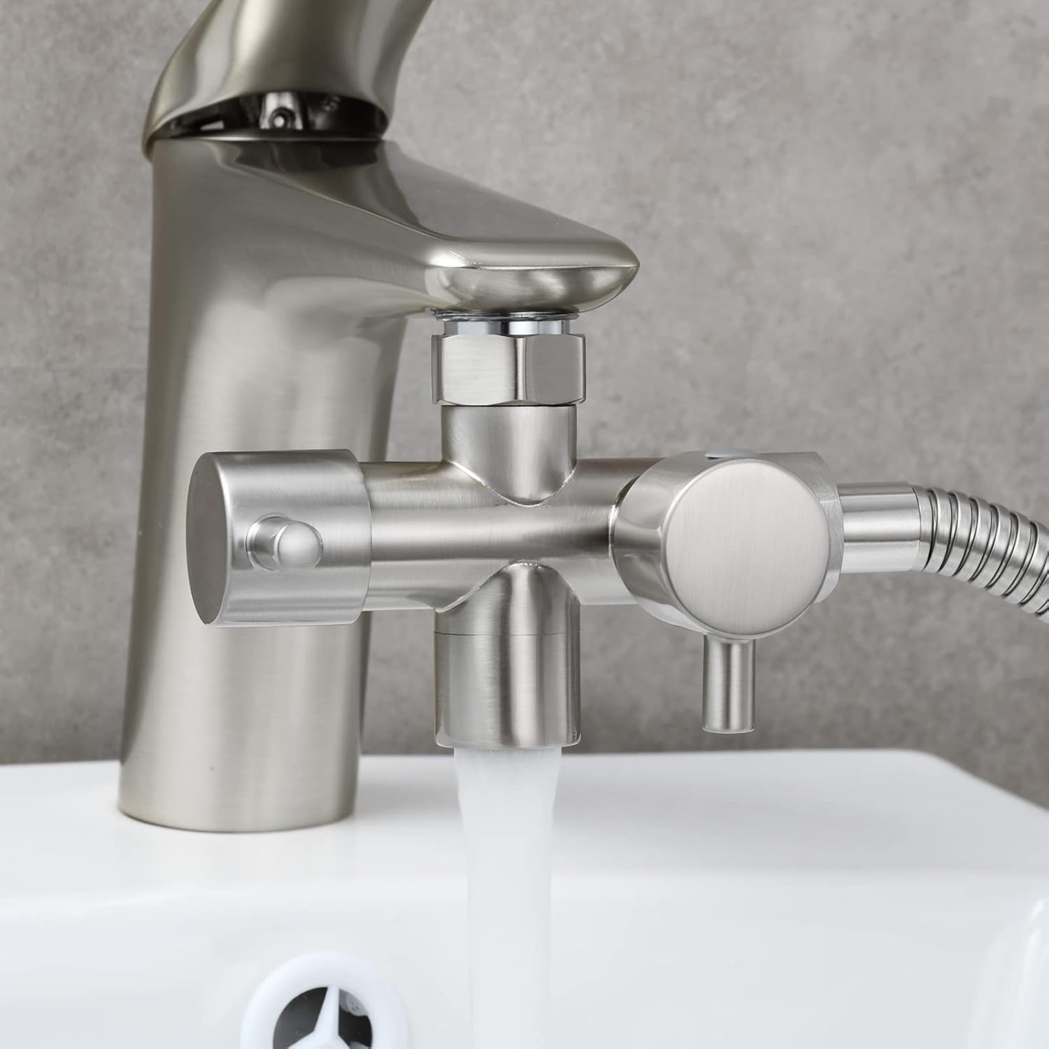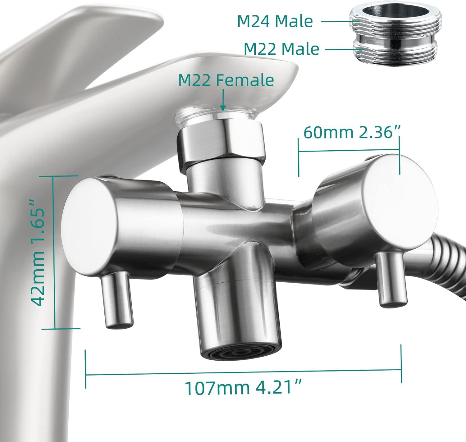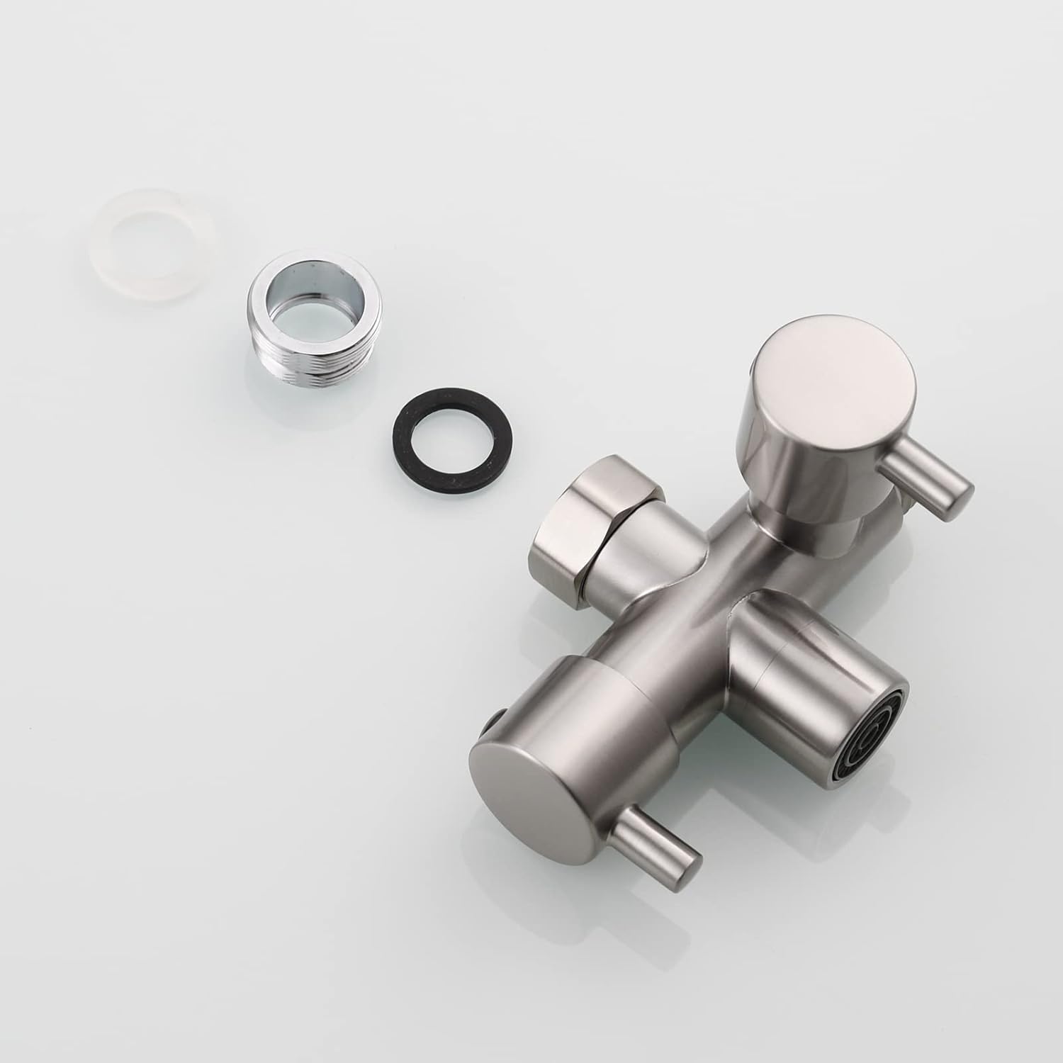 Our Tecmolog faucet diverter fit 55/64 male thread faucets & 15/16 female thread faucets. Please confirm the size of your faucets before buying.An included male by male threaded adapter is part of the package to convert female threads to male threaded faucet connector.Tecmolog Brass On Off Faucet Valve Adapter is designed to adjust the water volume to your liking or completely shut off the water flow.SpecificationsBody Material: BrassHandle Material: BrassFinish: Brushed NickelInstallation Method: Screw inConnection Size (Top x Side)Female 55/64 (0.86" or 22 mm) x Male G1/2" Package Included1 x Faucet Diverter M221 x M22 to M24 Male Adapter2 x Rubber GasketsIt is a diverter valve only, not included the shower hose and sprayer head.This faucet diverter is not suitable for connecting to a standard 3/4 inch garden hose.